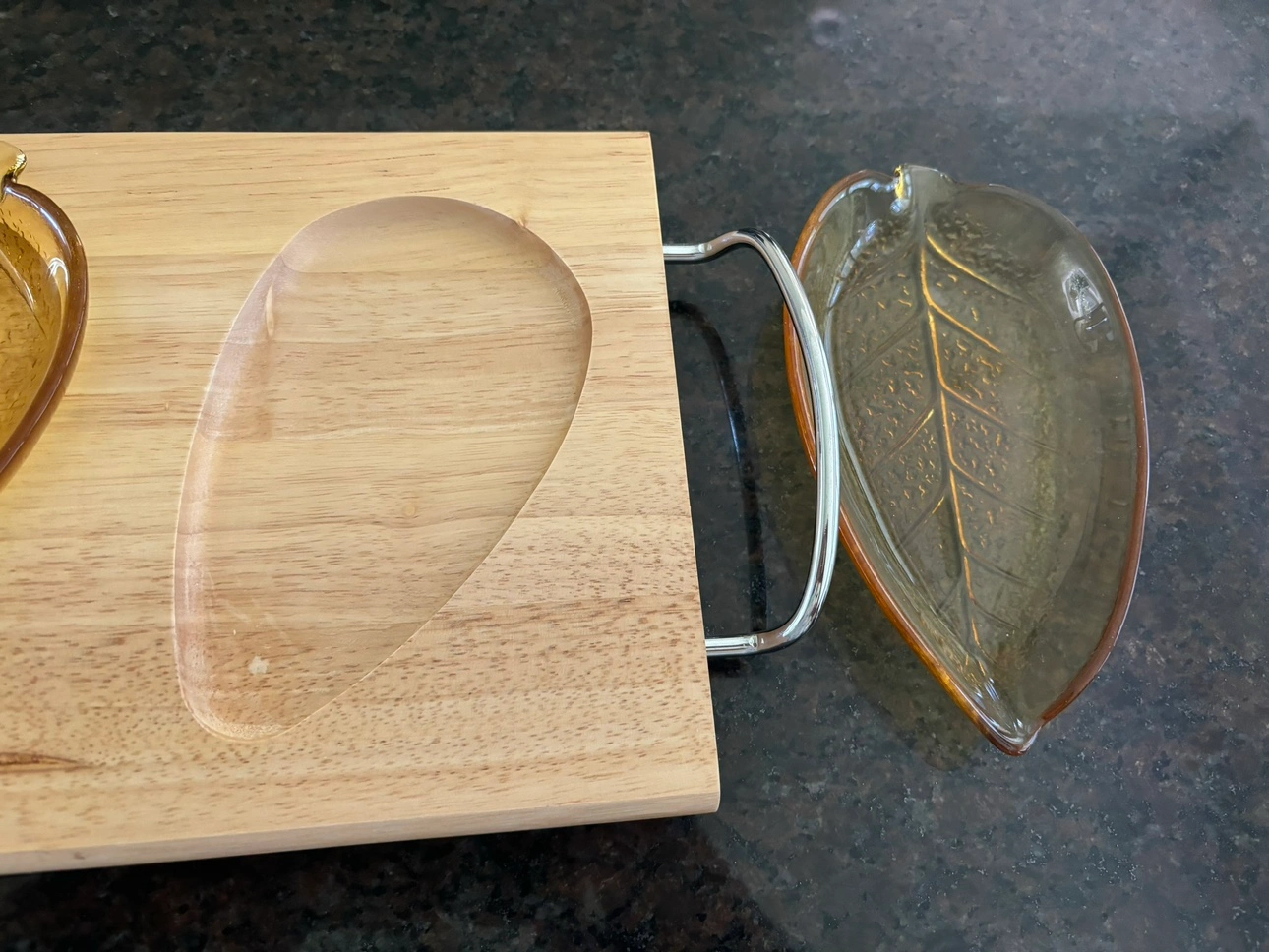 PU 2 km N of Hwy 401 & Weston Rd (Weston & Sheppard). No holds, cash only Vintage never used serving tray perfect for the fall season. Perfect giftable condition. No box. 3 amber glass leaves securely nestled in its own concave space. Has chrome handles and rubber feet. Tray 16.5” long x 8” wide x 1” high…..19 1/4” from handle to handle. Glass leaves are 7.5” long x 4” wide at widest spot.