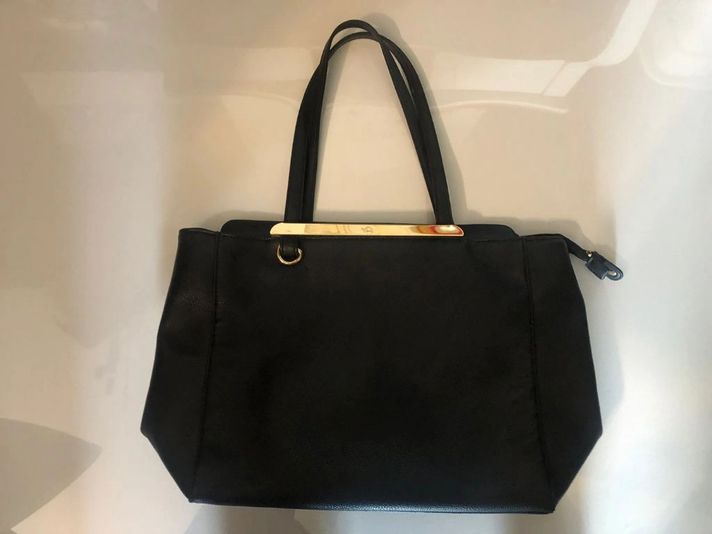 Black tote bag with gold hardware. Has a zipper closure and two handles. The bag is a great size for everyday use.