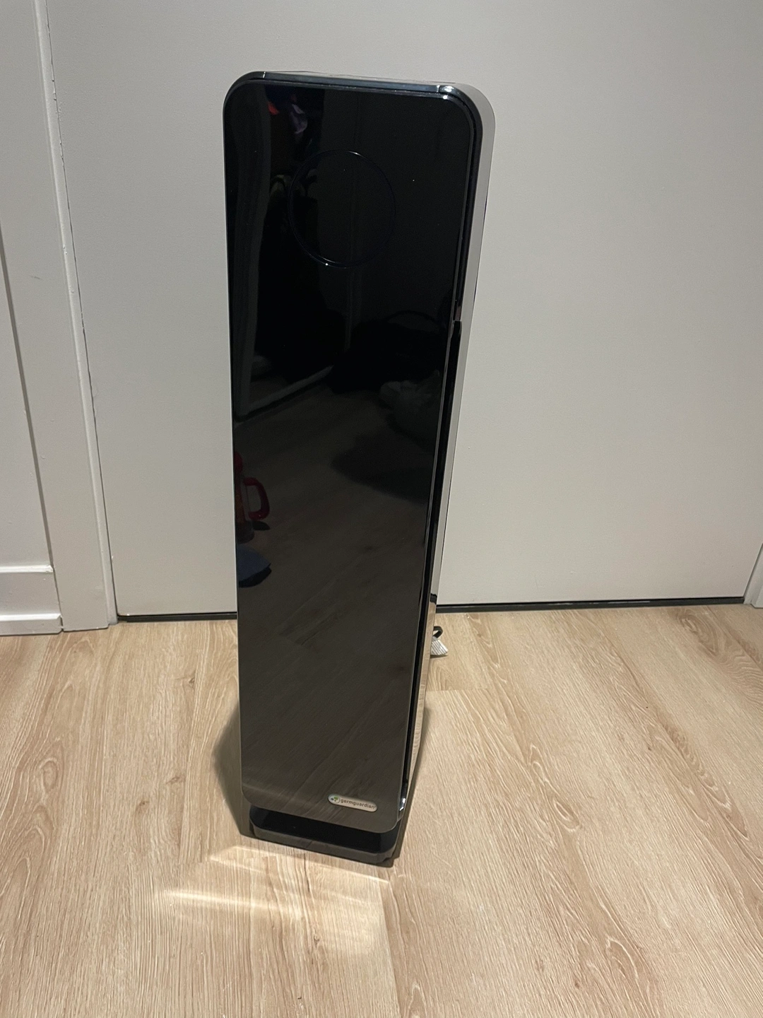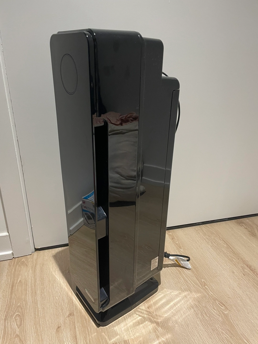 Black air purifier with a sleek design. It features a HEPA filter and a carbon filter to remove allergens and odours from the air. It has multiple fan speeds and a timer function. It is perfect for small to medium sized rooms. The unit is in good working order.