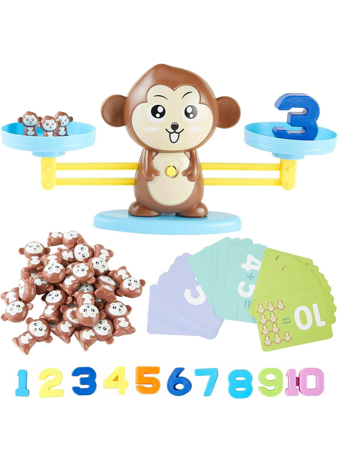 EDUCATIONAL MATH GAME: Introduce your little one to numbers and counting in a fun way! This game teaches the basic concepts of counting and math skills through this multi-stimulation toy. STEM TOY: This Monkey Balance toy is good for preschoolers to learn at home or school from parents, teachers or family. This toy encourages interactive play, boosts fine motor skill, visual and spacial processing, and helps to improve memory and problem solving skills. Helps to encourage and stimulate learning at home, school, nursery or tutoring. INCLUDES: 19 monkeys, numbers 1–10, 30 double-sided cards, monkey scale, base and 2 scale pans.