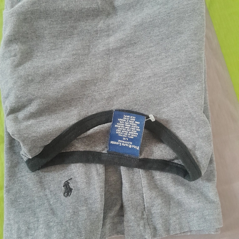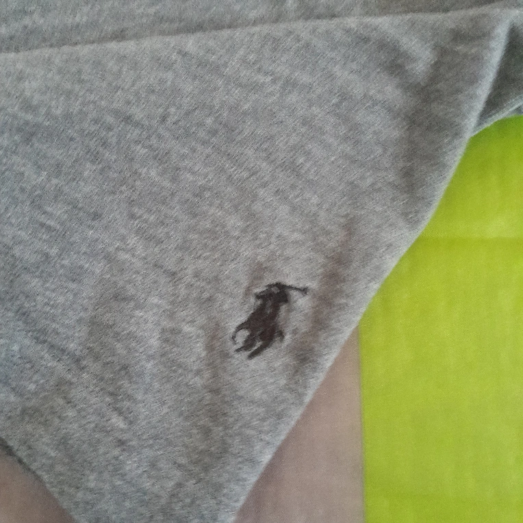 Grey T-shirt with a black trim around the neck and a small Polo Ralph Lauren logo