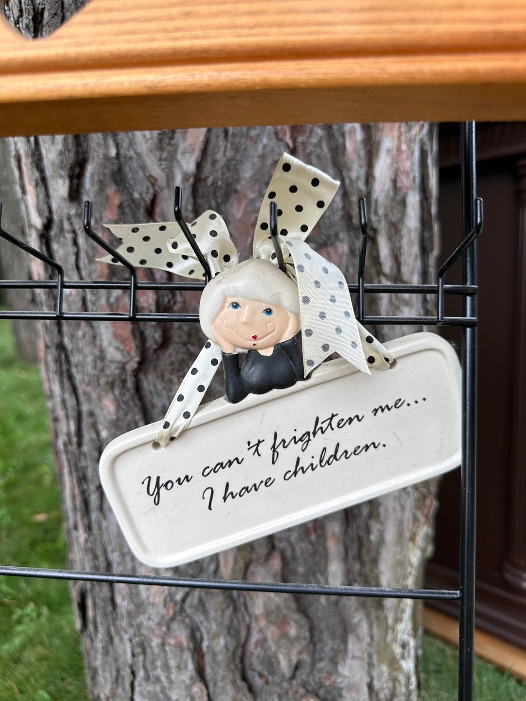 A ceramic sign with a black and white polka dot bow and an attached figure of a woman. The sign is white and reads "You can't frighten me I have children".