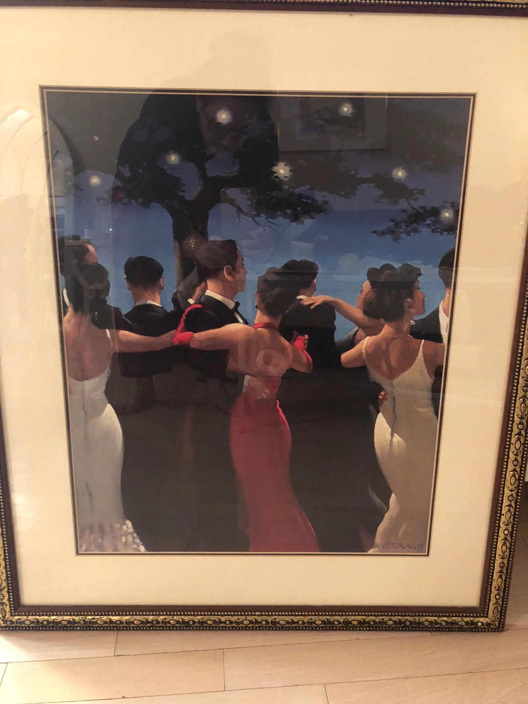 A framed painting featuring a group of people dancing under a tree at night. It is signed in the bottom right corner.