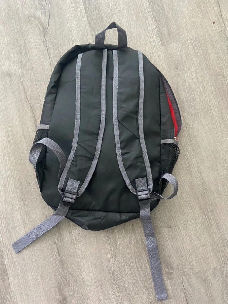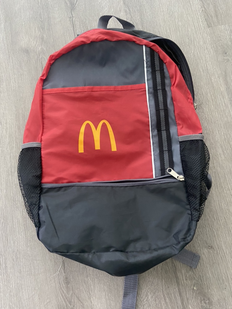 A black and red backpack with the McDonald's logo. It has a mesh pocket on the side and a zippered pocket on the front. It has adjustable straps.