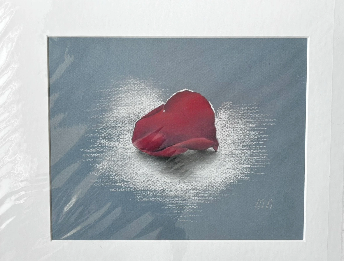 Original drawing of a single rose petal. Pastel pencils on blue toned pastel paper. 9x12” Certificate of authenticity is available upon request.