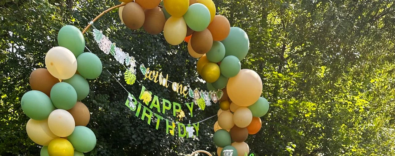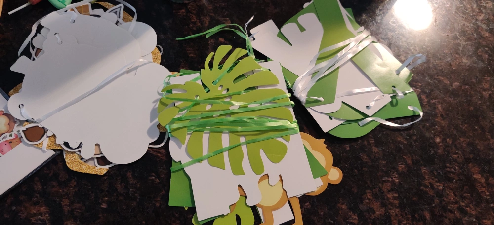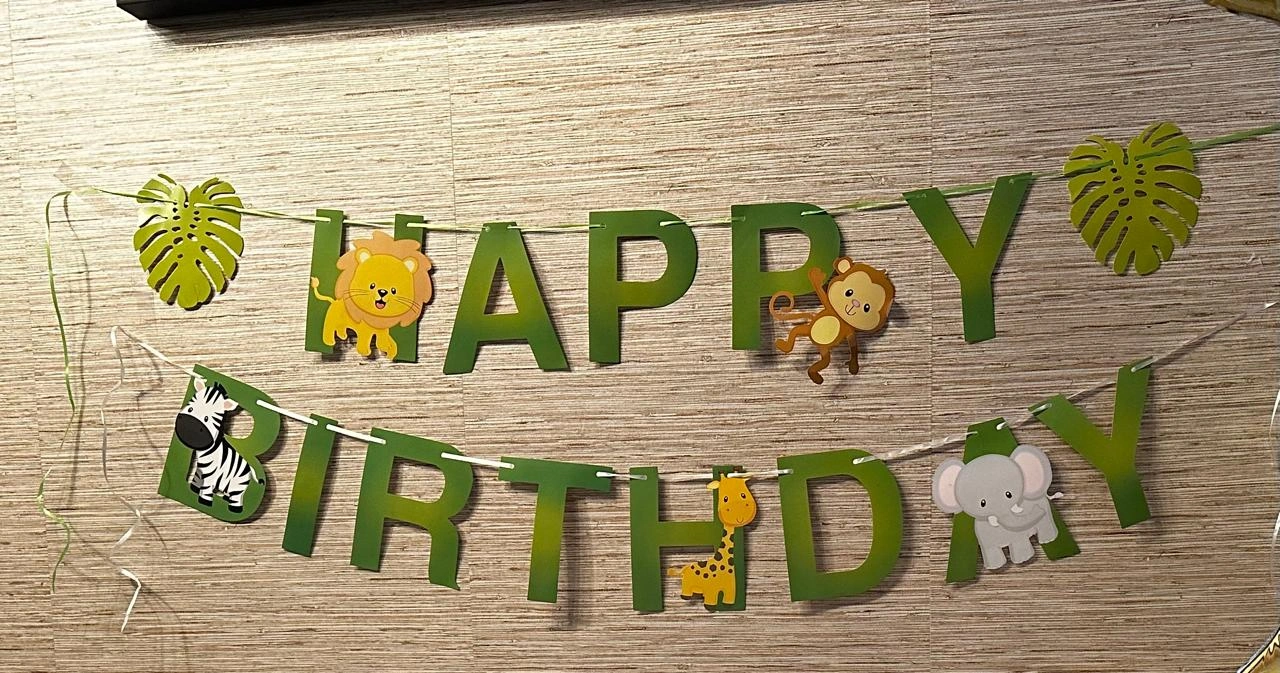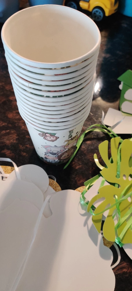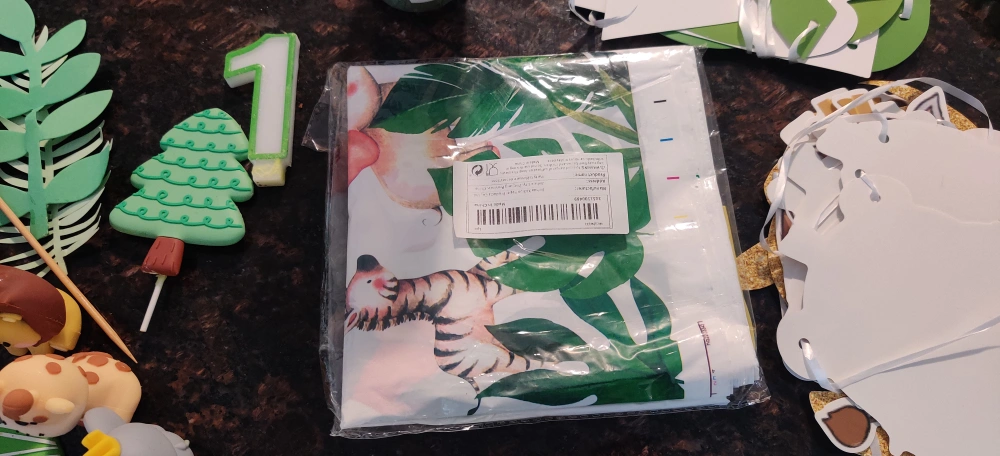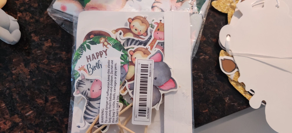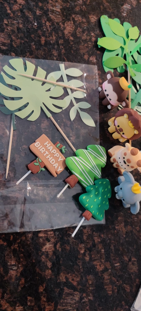 Cake topper set, includes 4 animals, trees, leaves, cupcake toppers, candle, 15 cups, table cloth and happy birthday & wild one banner. Perfect for a jungle themed birthday party. Everything for $10