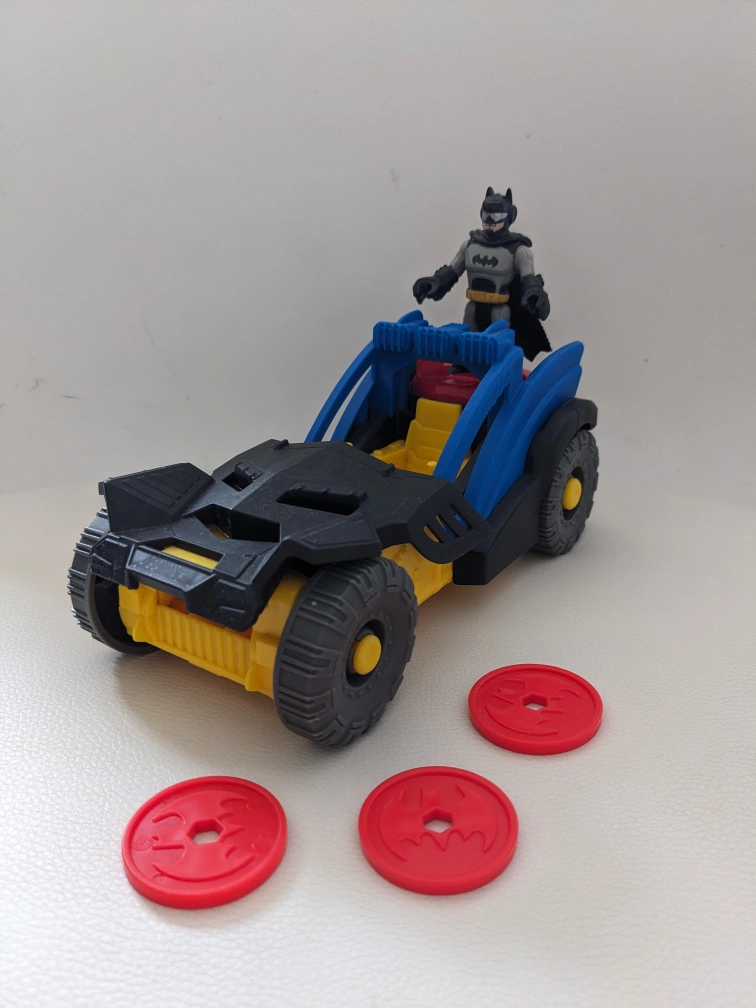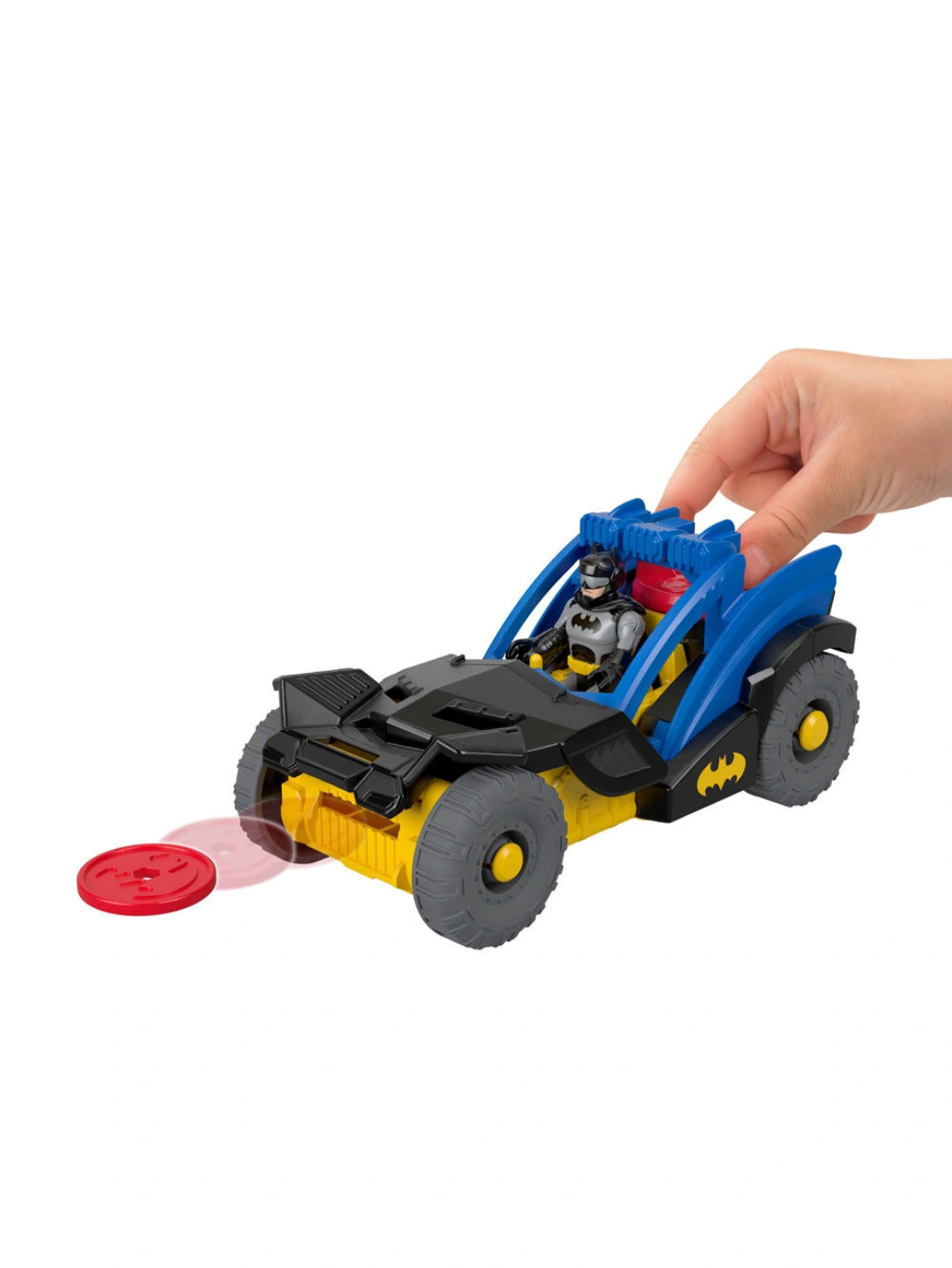 - Kids can protect the streets of Gotham City with this Batman figure and push-along Rally Car - Use the Power Pad to open the hood, load projectiles, and launch away - Move the figure’s arms and legs for more realistic action - Includes Batman figure, Rally Car, and 3 disk projectiles - Encourages imaginative play and storytelling