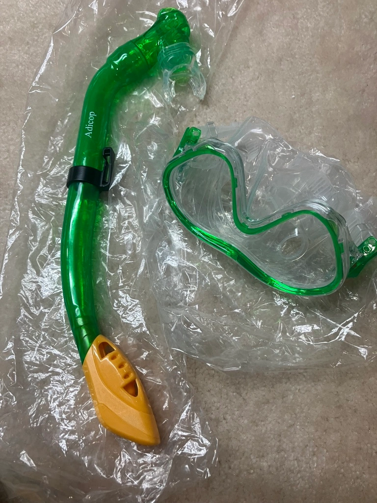 Green and yellow scuba snorkel set. Includes a snorkel and a pair of goggles.
