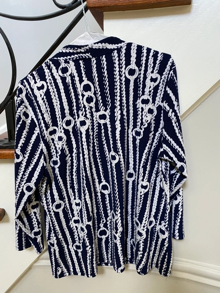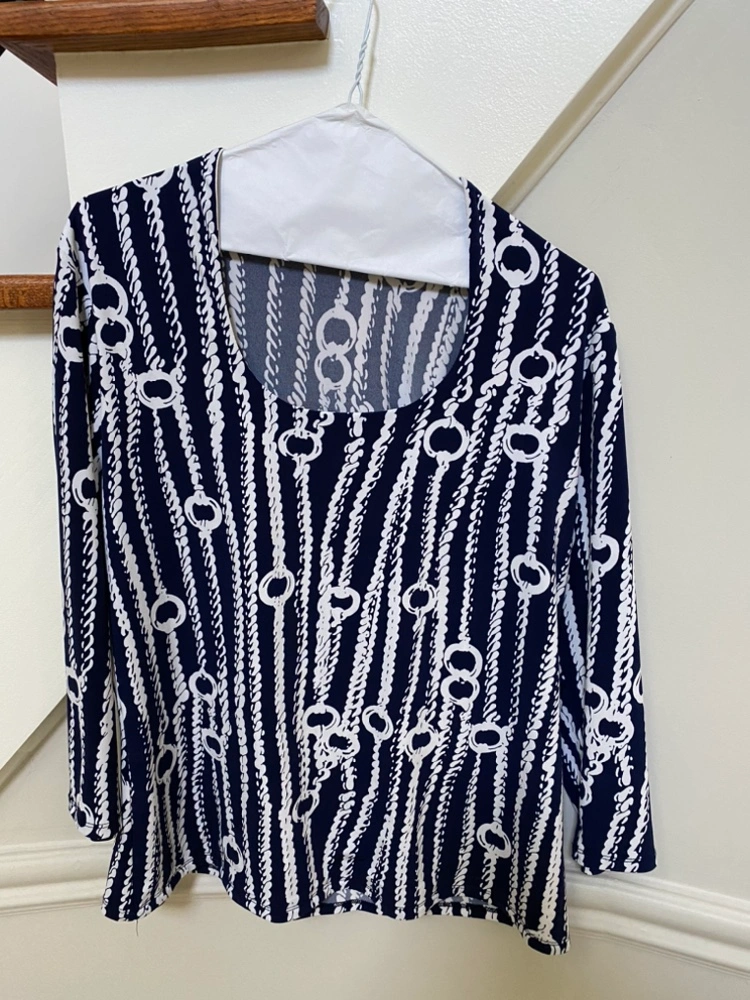 A blue and white patterned blouse with 3/4 sleeves. The pattern is of white chains on a navy blue background. The blouse has a square neckline.
