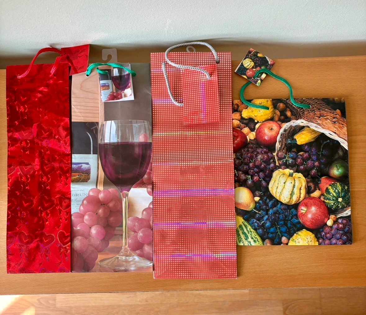 Priced for 3 wine gift bags with different designs, plus a harvest and a floral gift bags. All π Click on my name for my other listings and pickup locations.