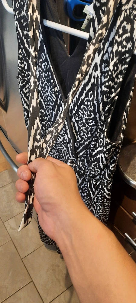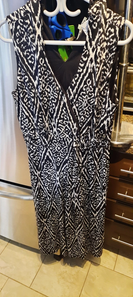 Brand New with tags Womens Cleo Large Jumpsuit. Sleeveless, black and white dress with a geometric pattern. The Jumpsuit has a v-neck and the fabric is stretchy and comfortable. Wife needs a medium and it's final sale. Retails for $90+. https://www.cleo.ca/crepe-wide-crop-jumpsuit-8260CR102410265.html