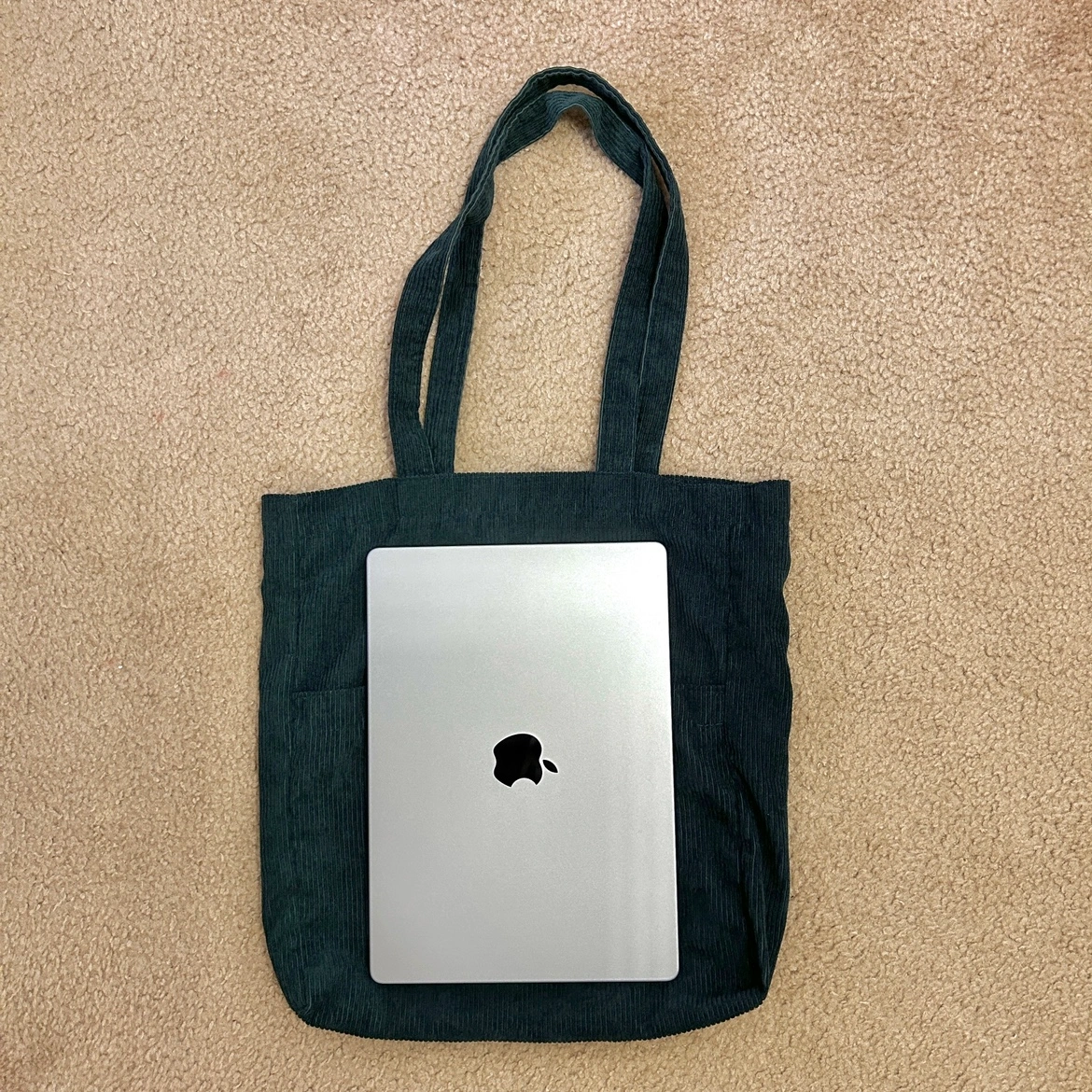 A cute corduroy tote bag that has a front pocket. It can fit a laptop. Pick up only.