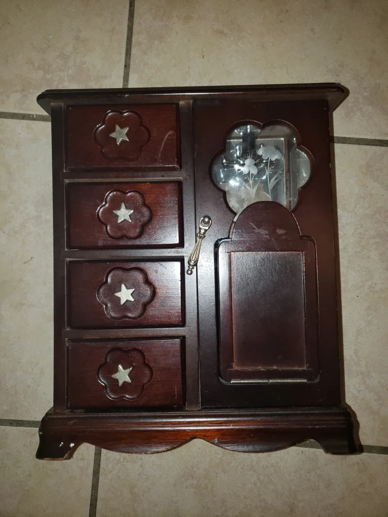 A wooden jewellery box with 4 drawers and a mirrored door with an etched design on the glass. It has a ring holder and a hook for necklaces.