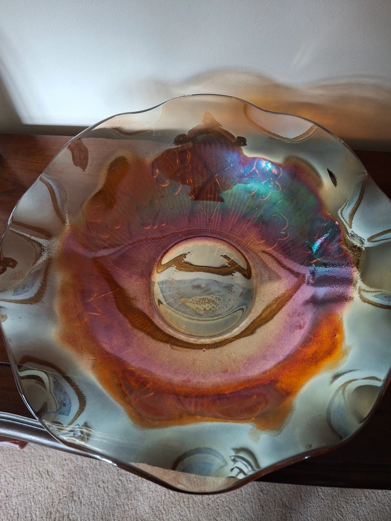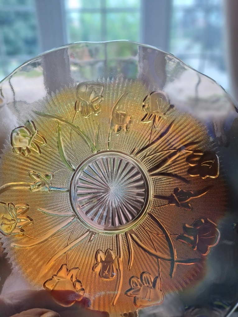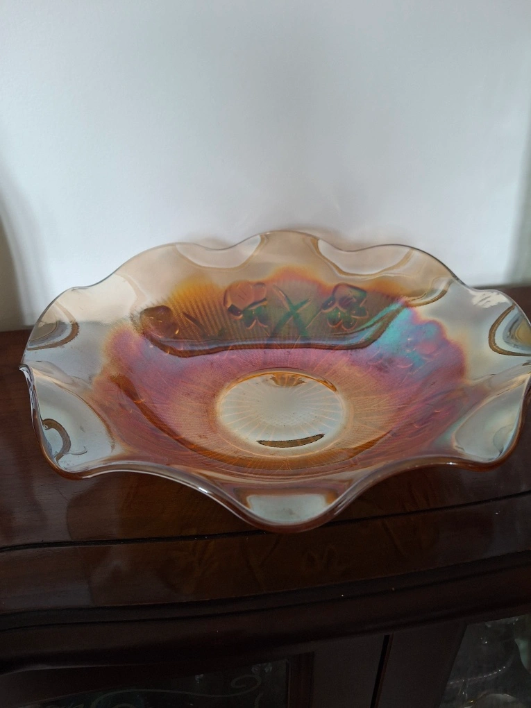 Fluted orange iridescent glass bowl. Detailed raised flowers on the outside. 11.5” wide and 3” high. Excellent condition. Available for pickup in Markland Wood.