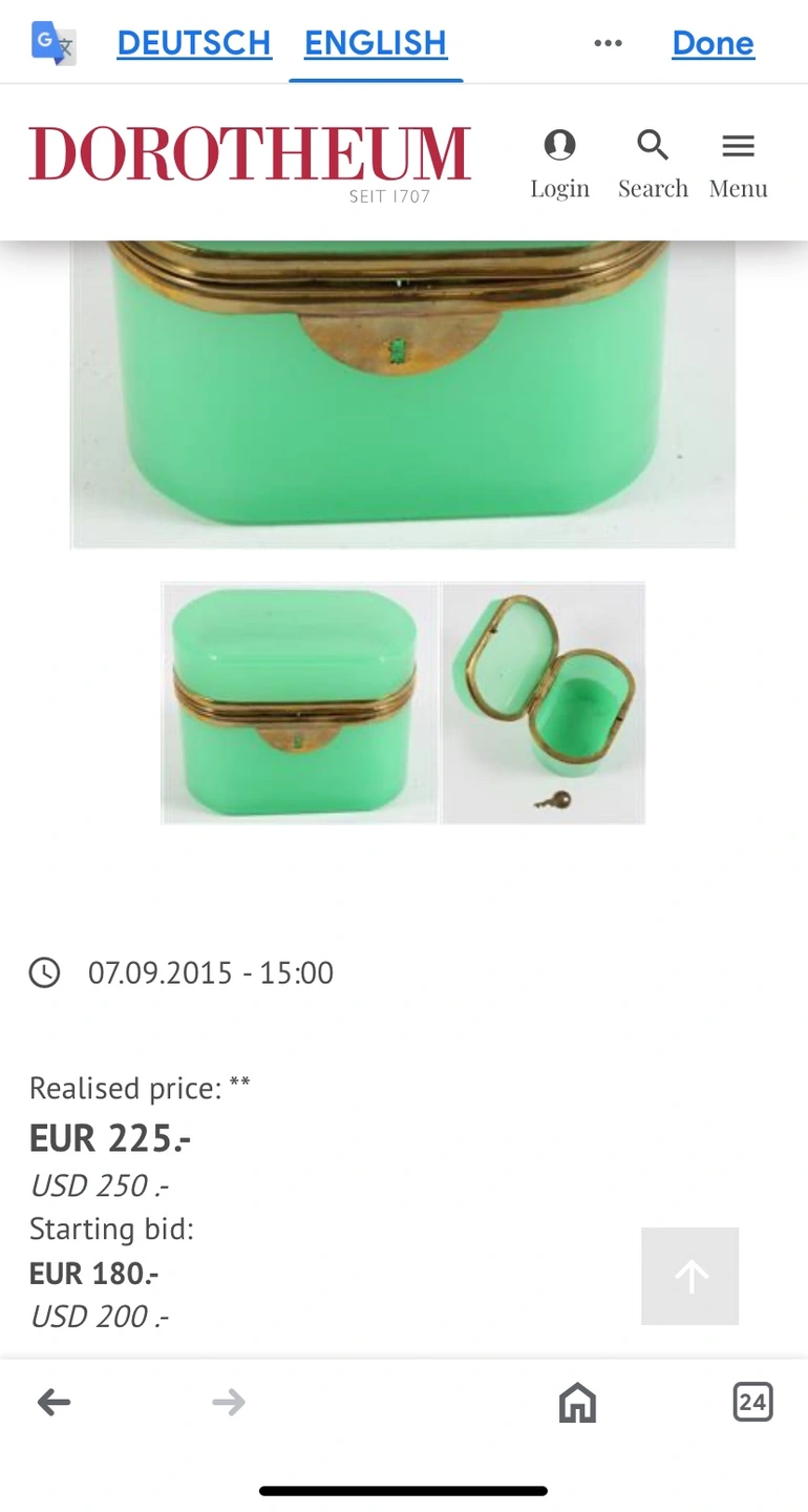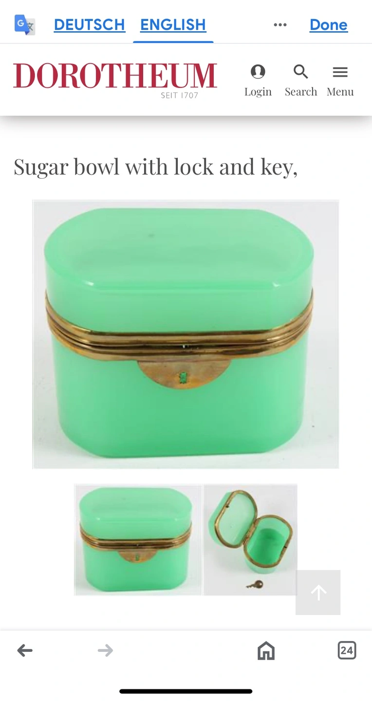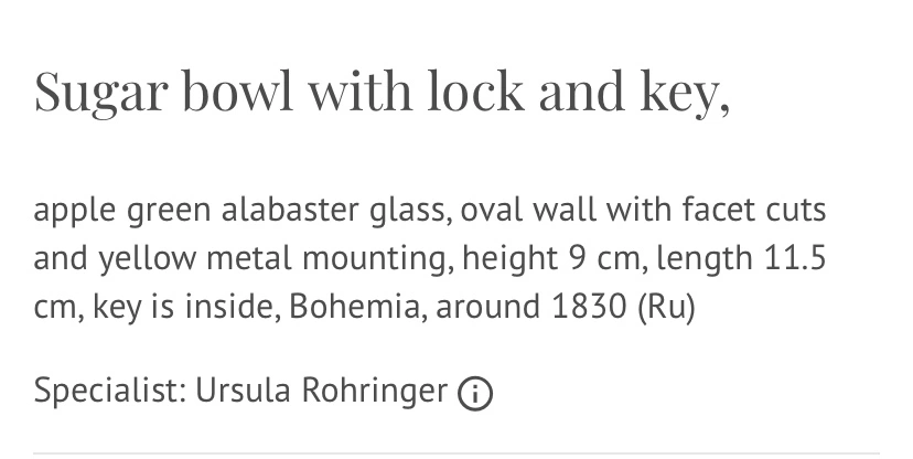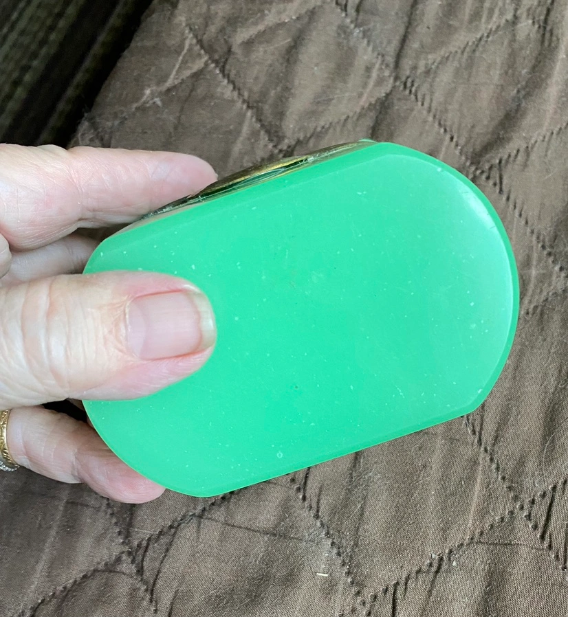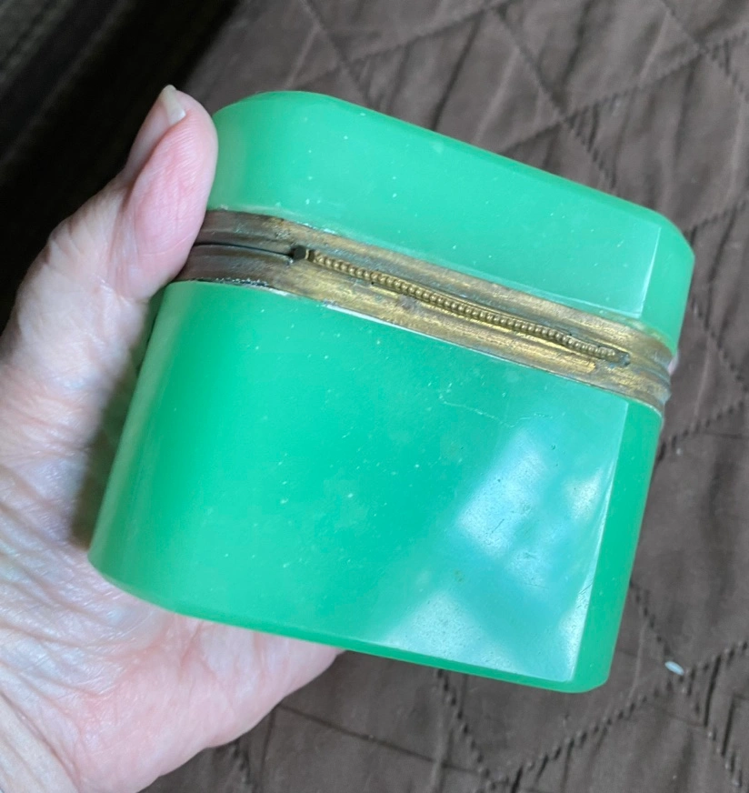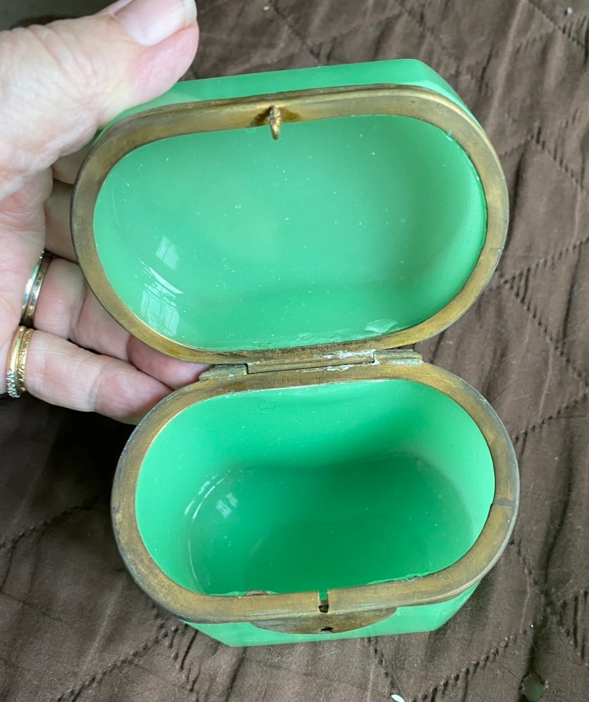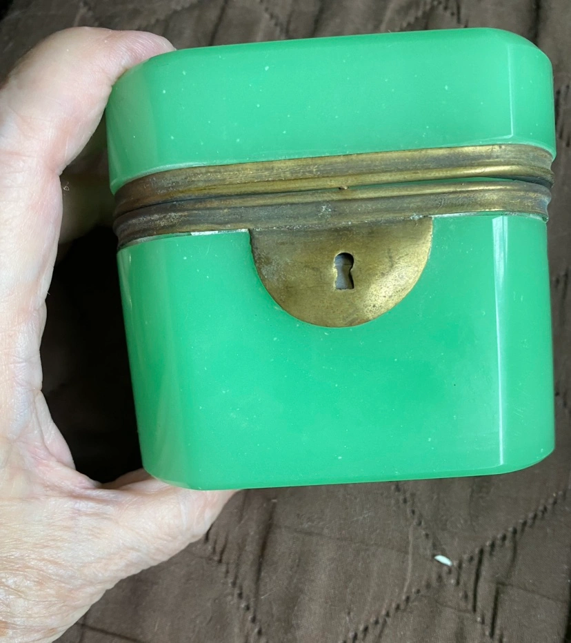 A small, green glass trinket box , originally a sugar box for dining table, unfortunately no key. Russian with a brass hinge and lock. The box is in good condition for its age.