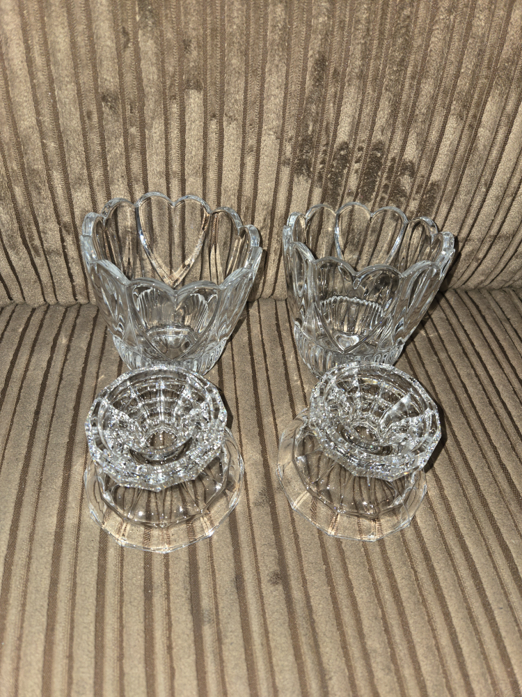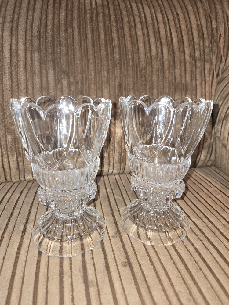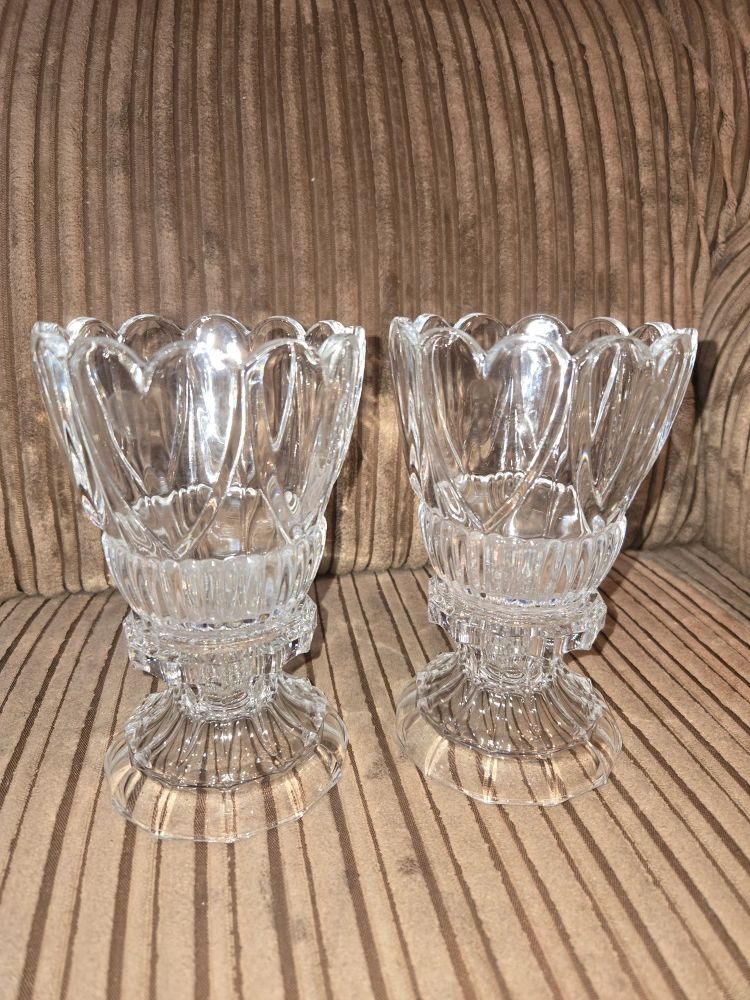 Set of two crystal candle holders. Each holder has a base and a top piece. They can used in multiple ways and with different types of candles. Very versatile!