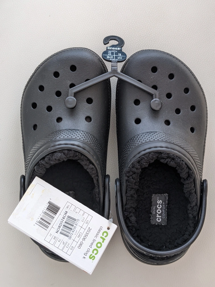 Crocs Kids' Classic Lined Clogs Kids' Classic Lined Clog Details: The legendary Kids' Classic Clog, now with a warm, fuzzy liner Incredibly light and easy to wear Pivoting heel straps for a more secure fit Great indoors or out Customizable with Jibbitz™ charms Dual Crocs Comfort™: Blissfully supportive. Soft. Cradling comfort. Fuzz Liner: Made of 100% Polyester Size: C13