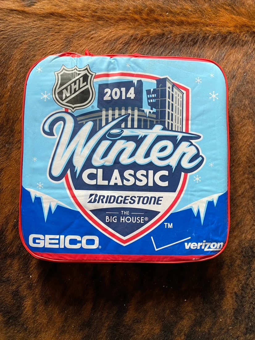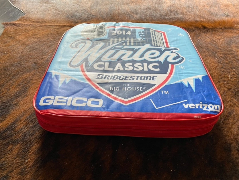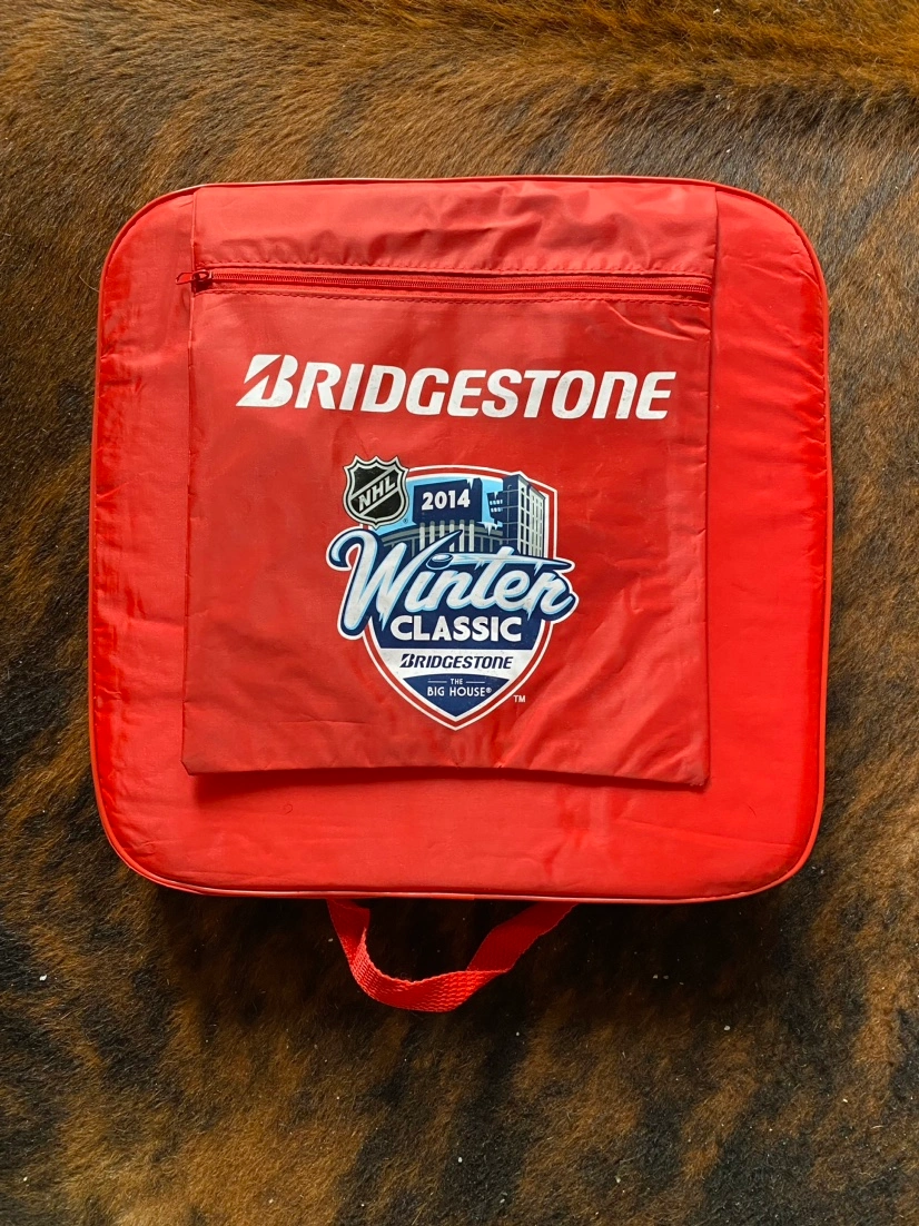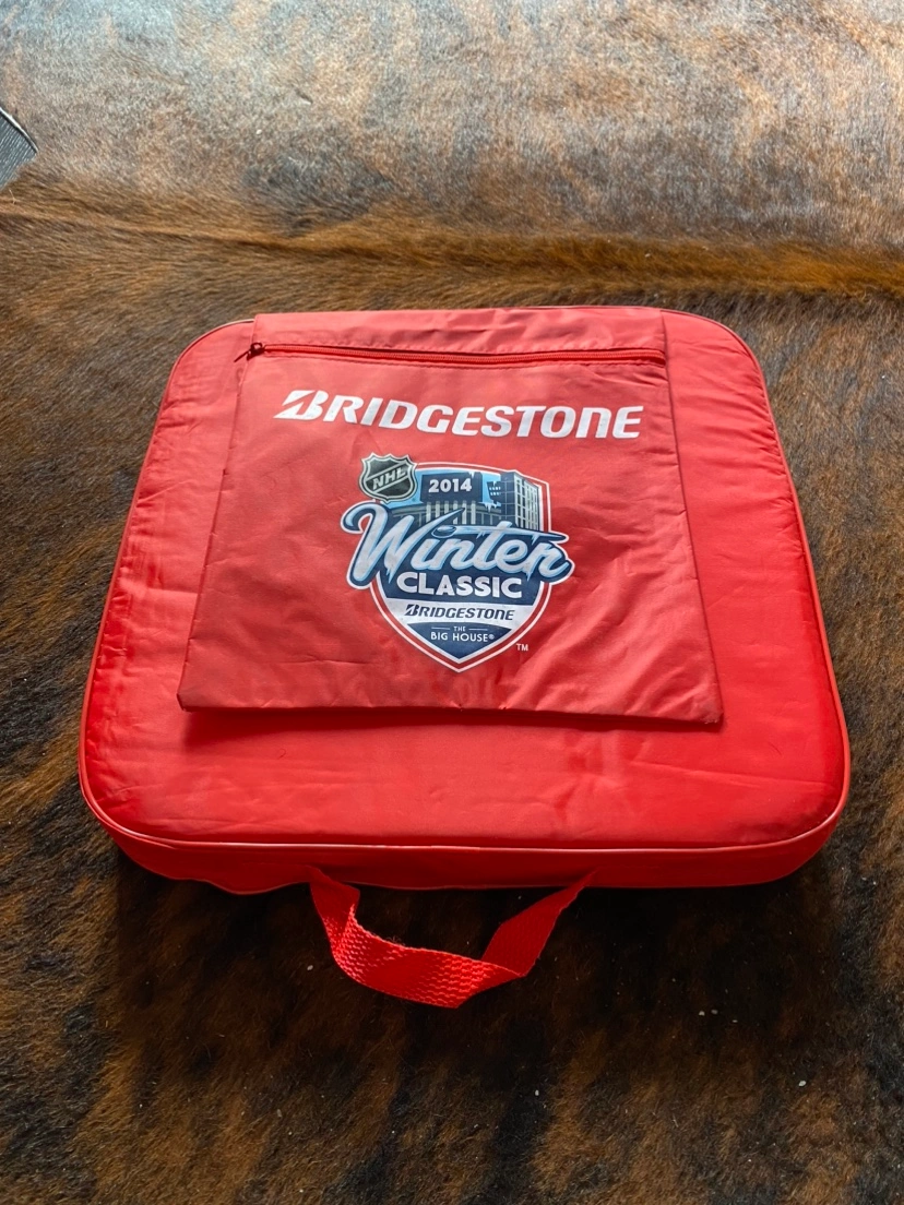 This is a red and blue seat cushion with the Bridgestone 2014 NHL Winter Classic logo on it. It has a zippered pocket on the back. The cushion is designed to be comfortable for sitting on a hard surface like bleachers. It is in good condition.