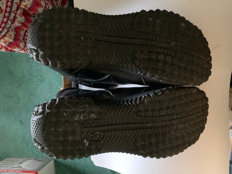 Black leather boots with side zippers. The boots are lined with a soft, fuzzy material. They are a size 41. The boots are in good condition. They have a small amount of wear on the soles, but they are still very wearable. They are very comfortable to wear and would be great for the winter. Length 9.93 inches
