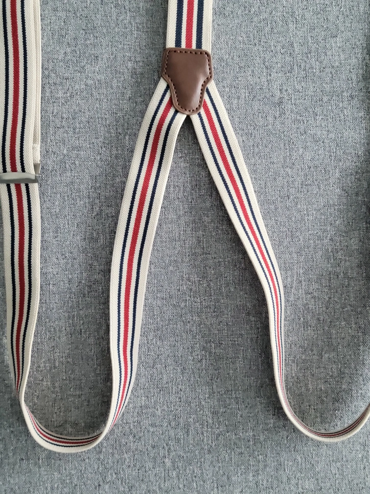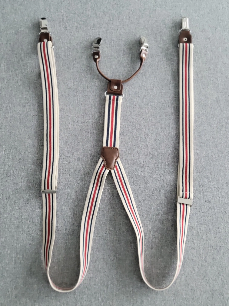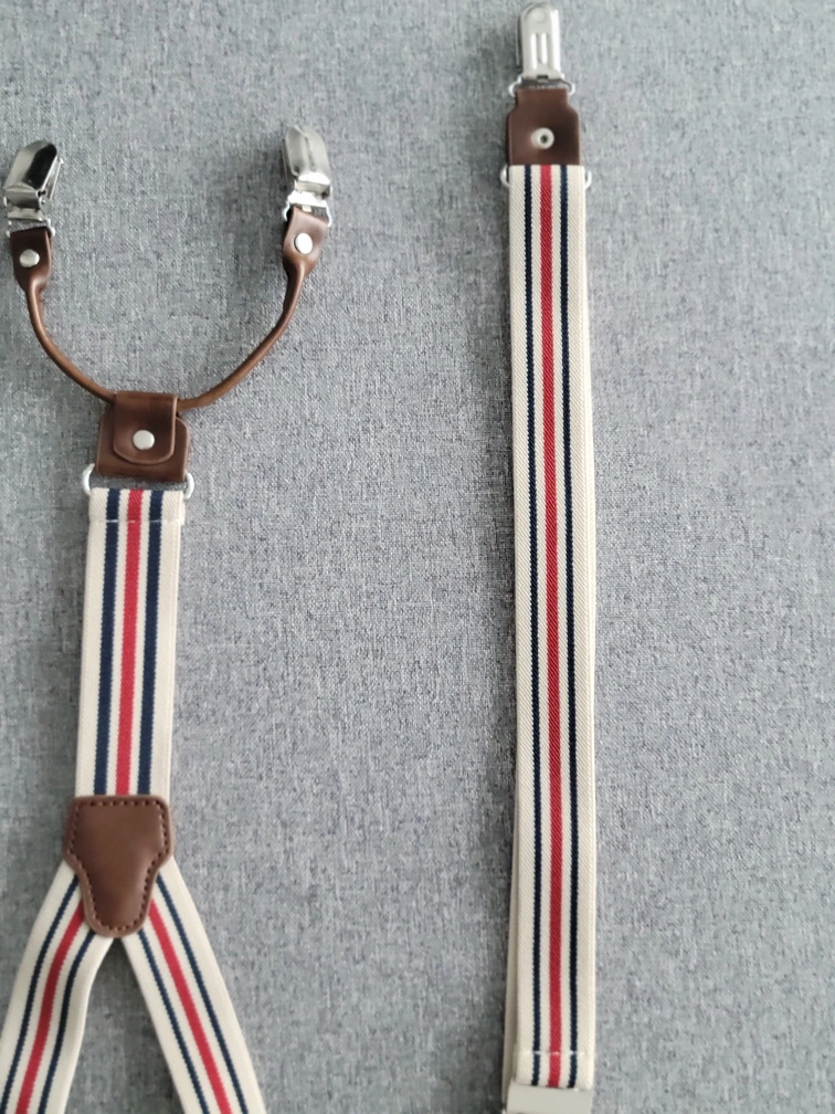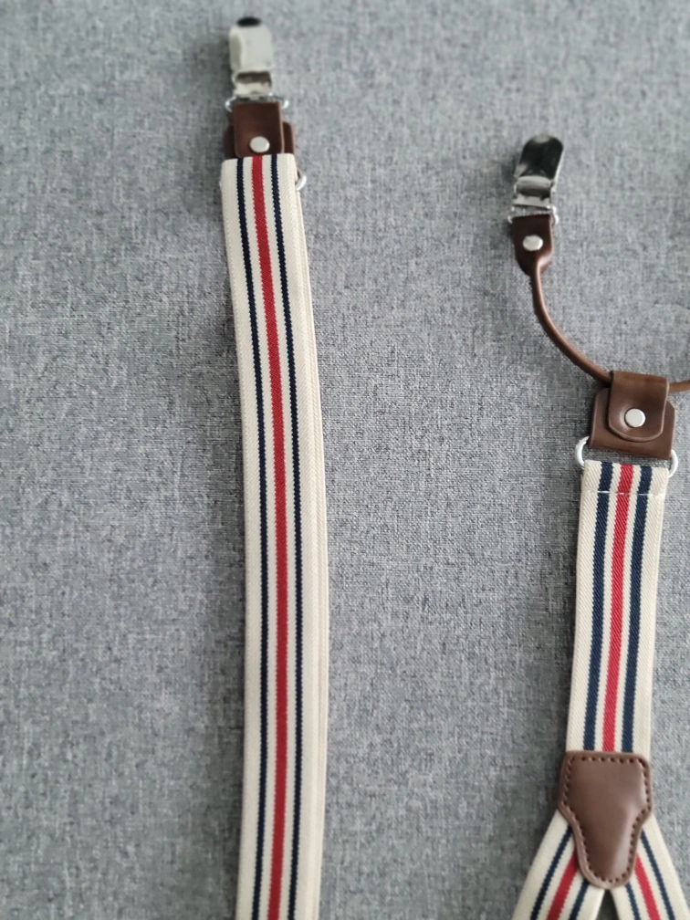 These are white suspenders with red and blue stripes. They have leather accents and clips.