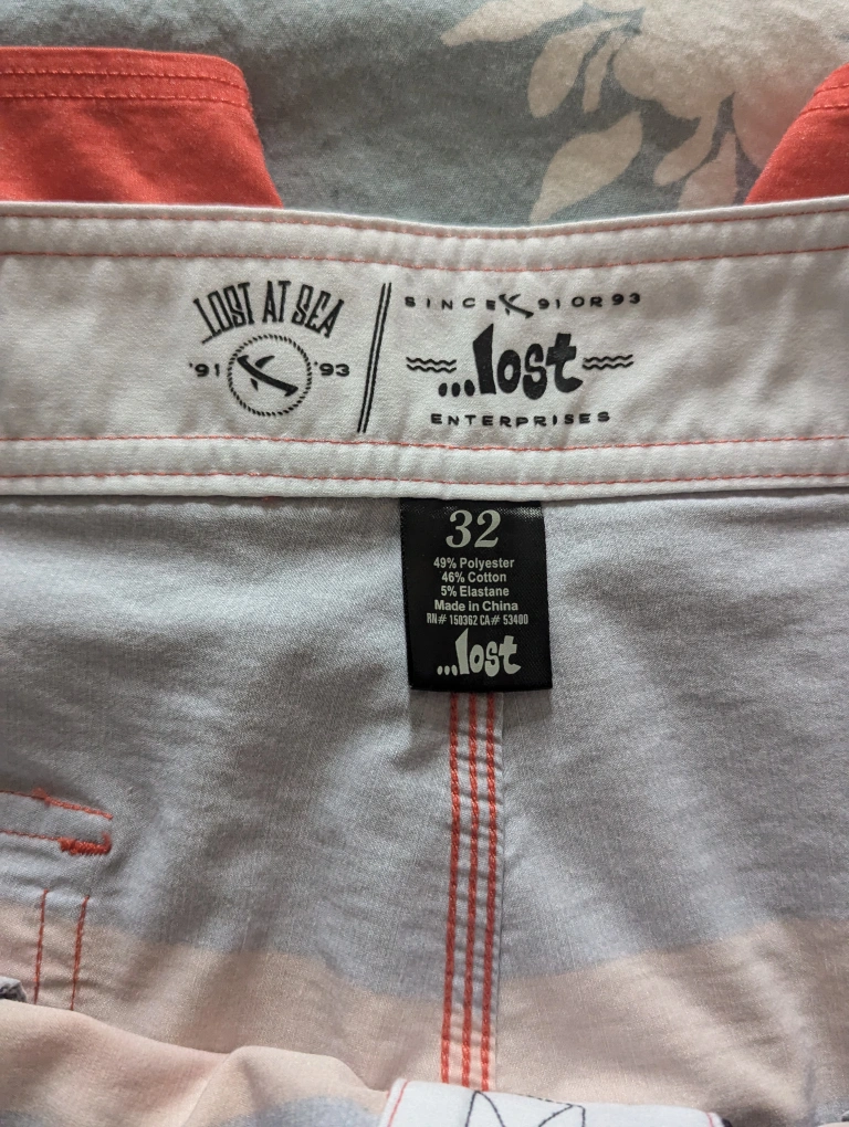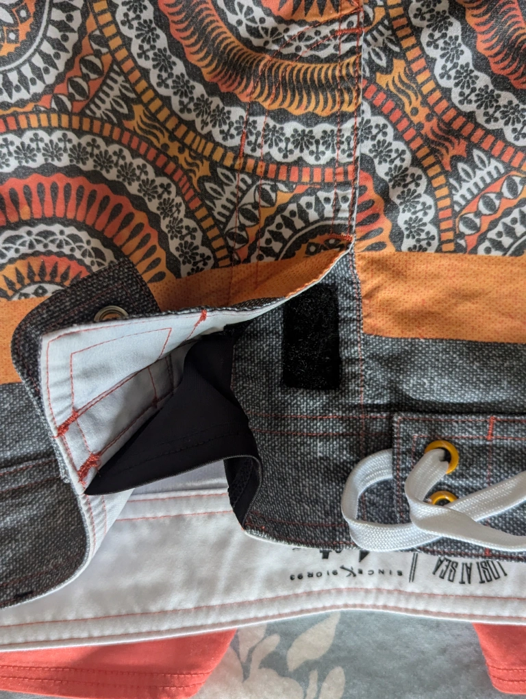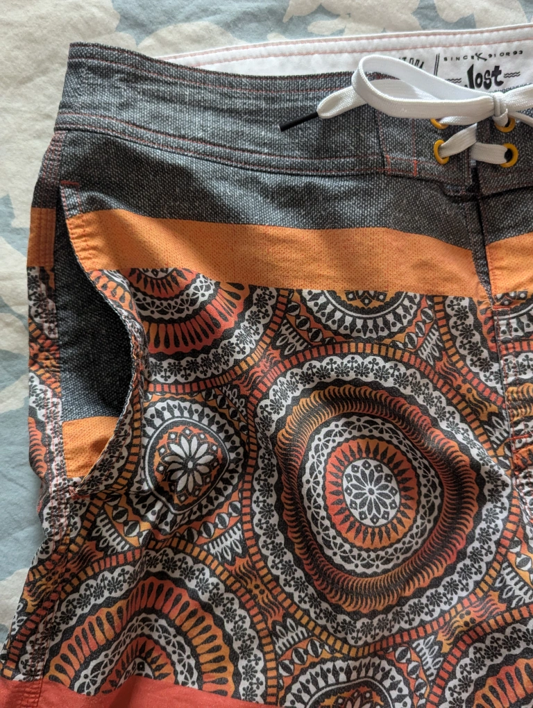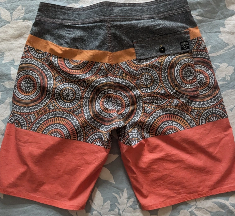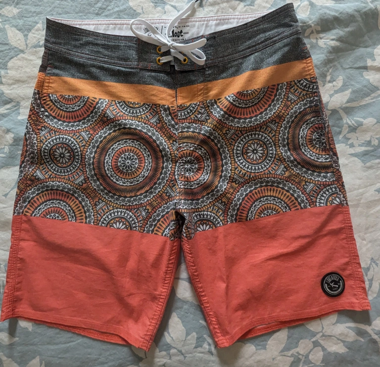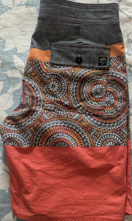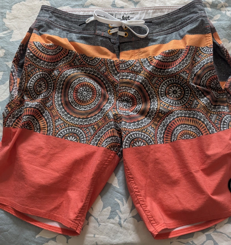 Lost at sea Orange & Gray mandala print man's shorts -size 32 Used one time, excellent condition , See photos for details ☝️ Reason for selling the small size.Men's boardshorts in a colourful pattern. They have an elastic waistband with a drawstring and a velcro closure. There is a back pocket with a button closure.