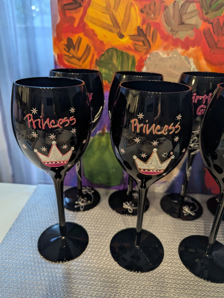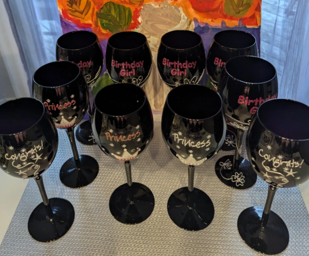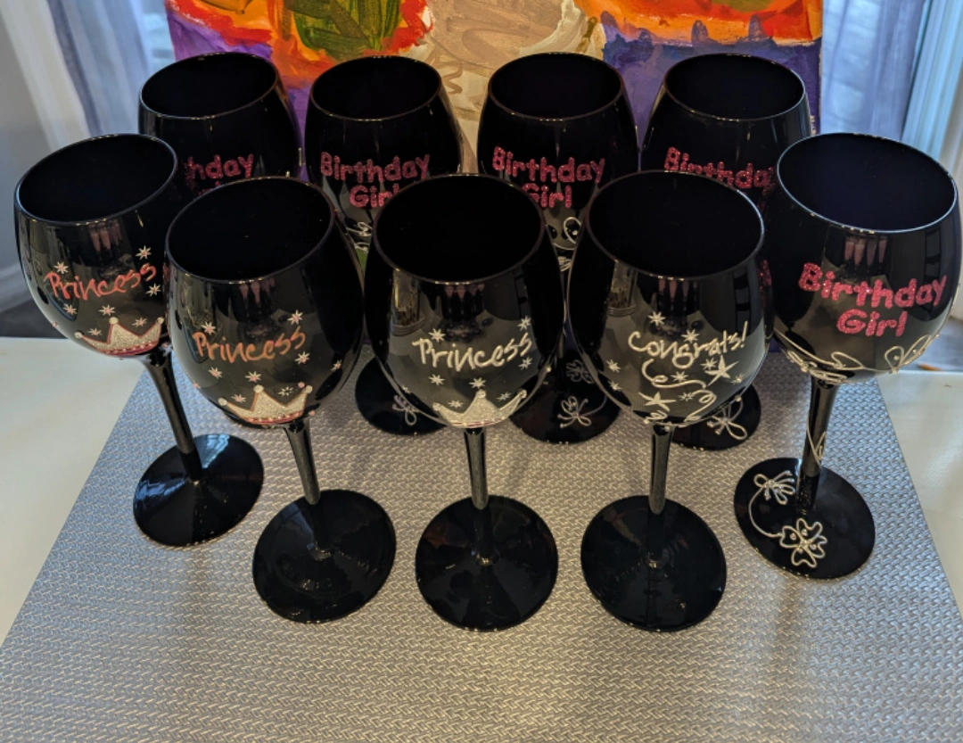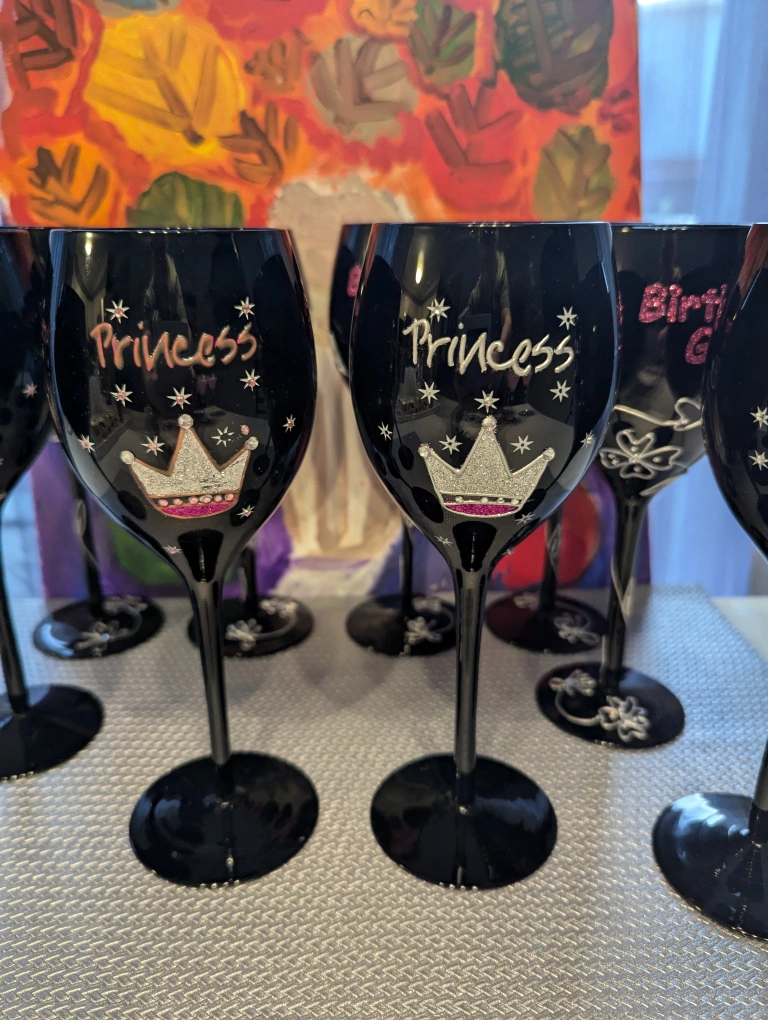 Celebrate in style with this Birthday Girl, Congrats, Princess Pink & Silver Decorations Black Wine Glasses . The black wine glasses features a fun and festive birthday pattern in pink and silver, making it the perfect accessory for any birthday celebration. New 10 pieces