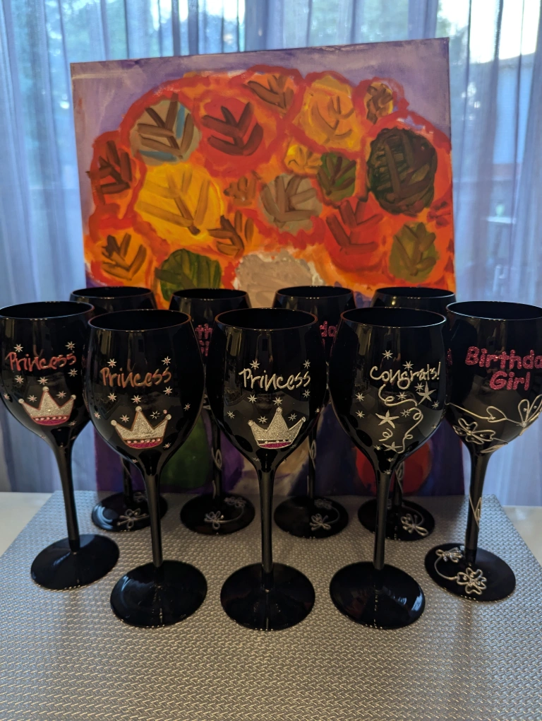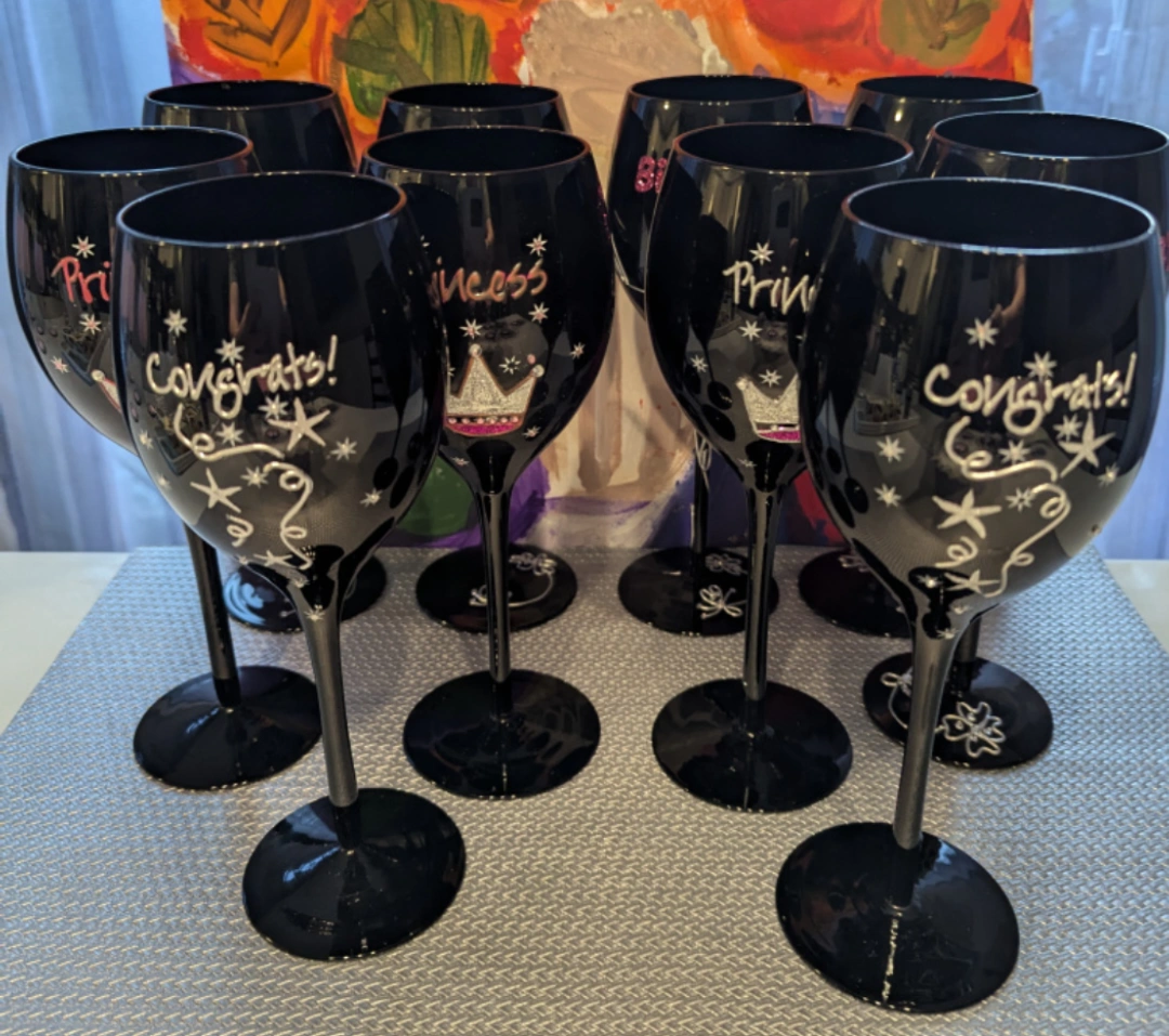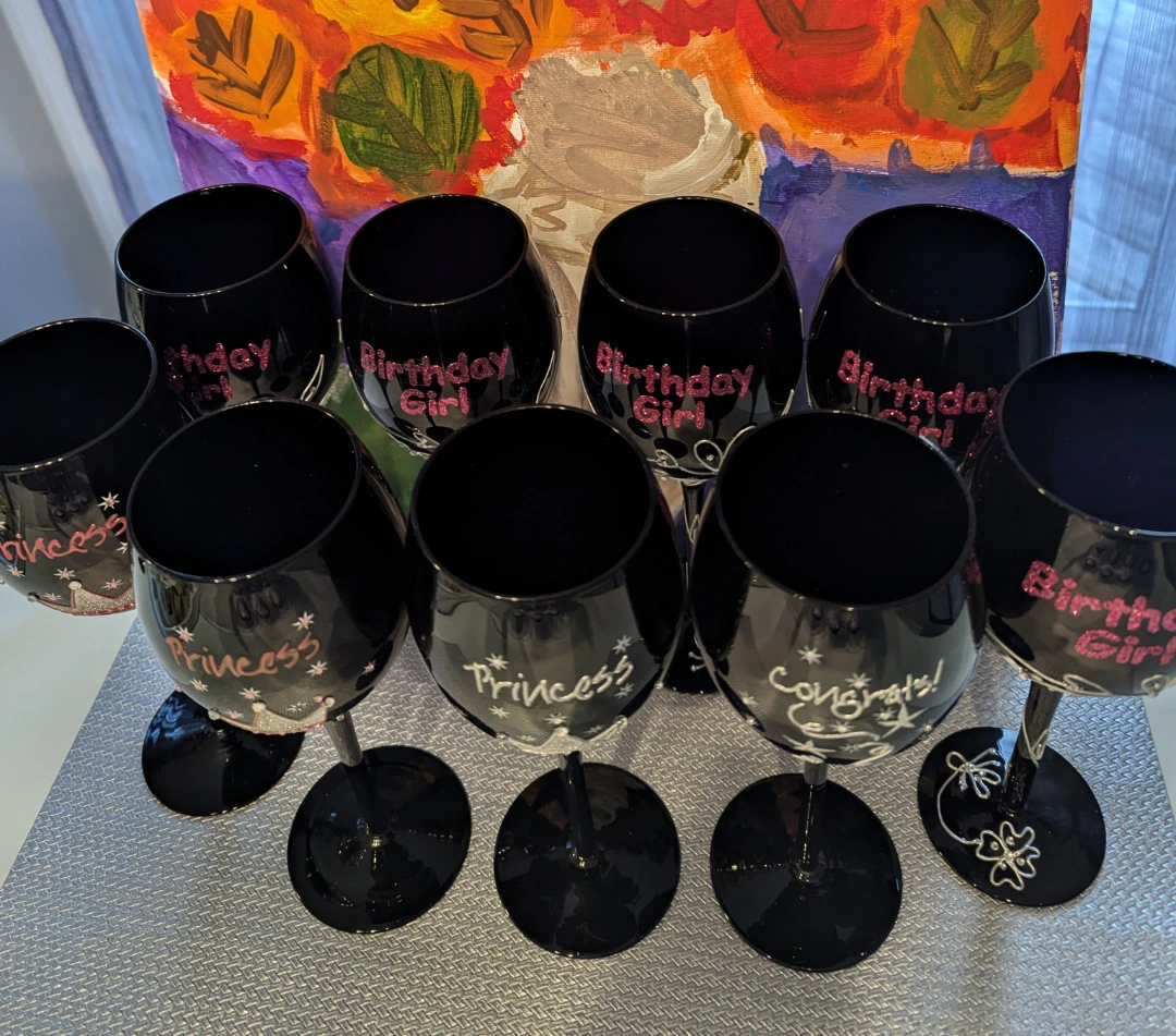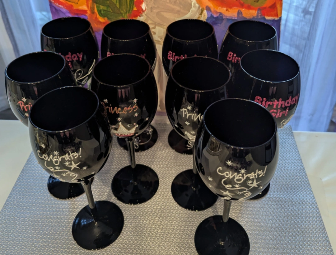 Celebrate in style with this Birthday Girl, Congrats, Princess Pink & Silver Decorations Black Wine Glasses . The black wine glasses features a fun and festive birthday pattern in pink and silver, making it the perfect accessory for any birthday celebration. New 10 pieces