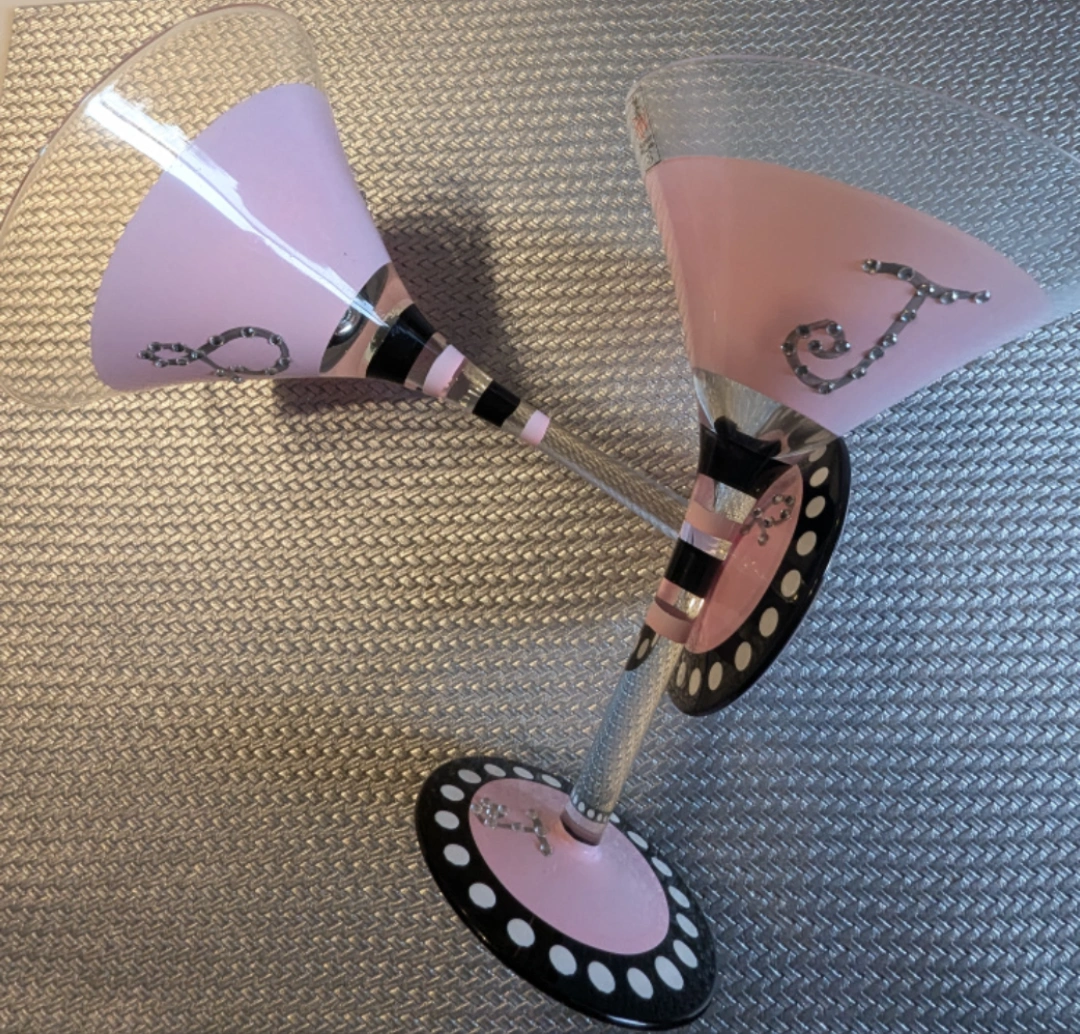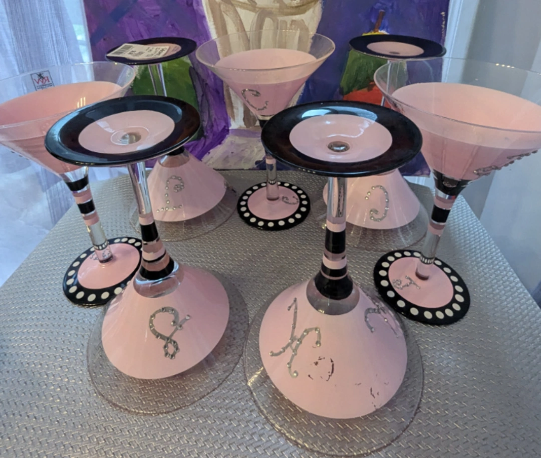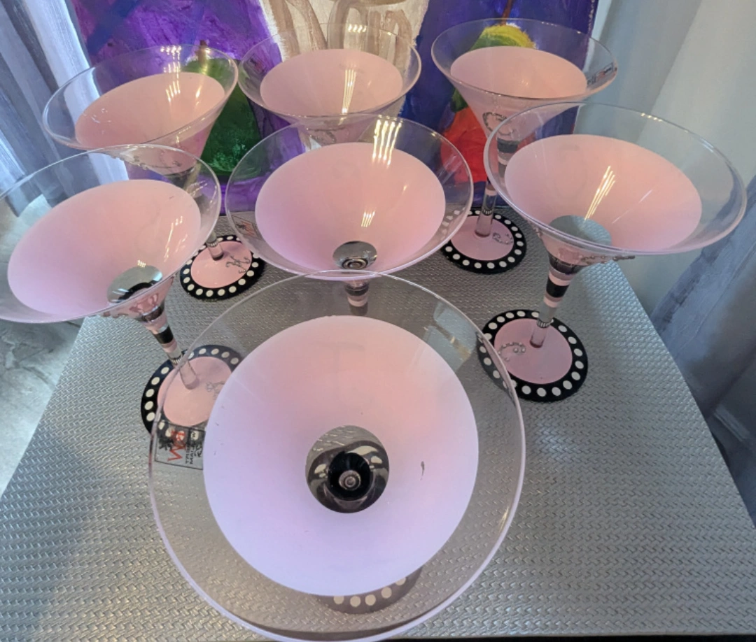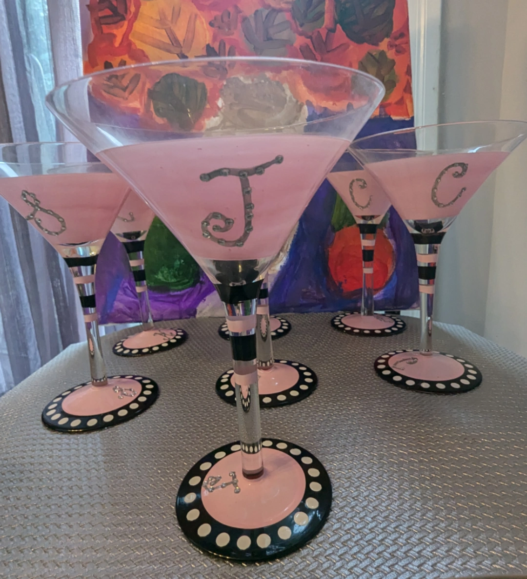 Pink and black striped martini glasses with letters in silver. Base has white polka dots on black background. 7 pieces Used 1 time