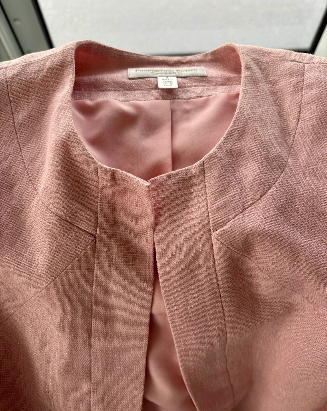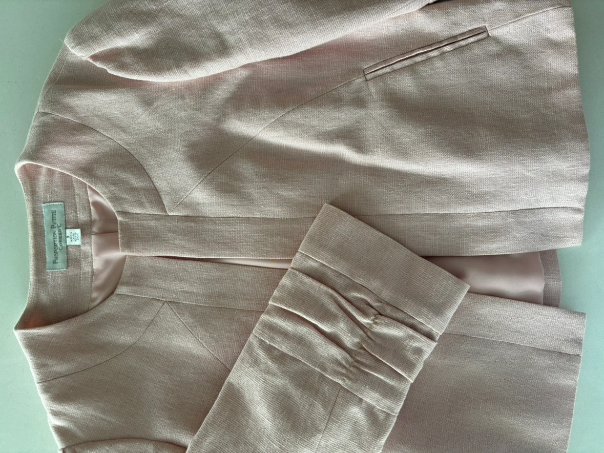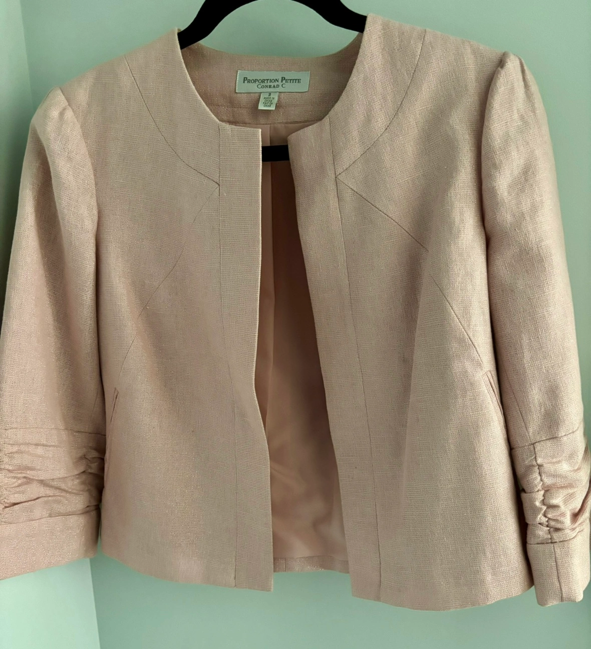 A pale pink linen blazer with a fitted cut and a slight sheen. Actual colour is more vibrant! It has a round neckline and three-quarter length sleeves. The sleeves have a slight gathering at the wrist. It is a great option for dressing up a casual outfit or for wearing to a summer wedding. Worn once only to a function, and just washed. Click on my name for my other listings and pickup locations.