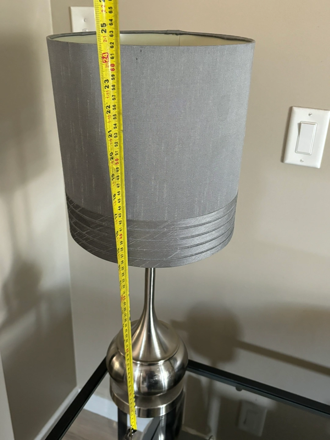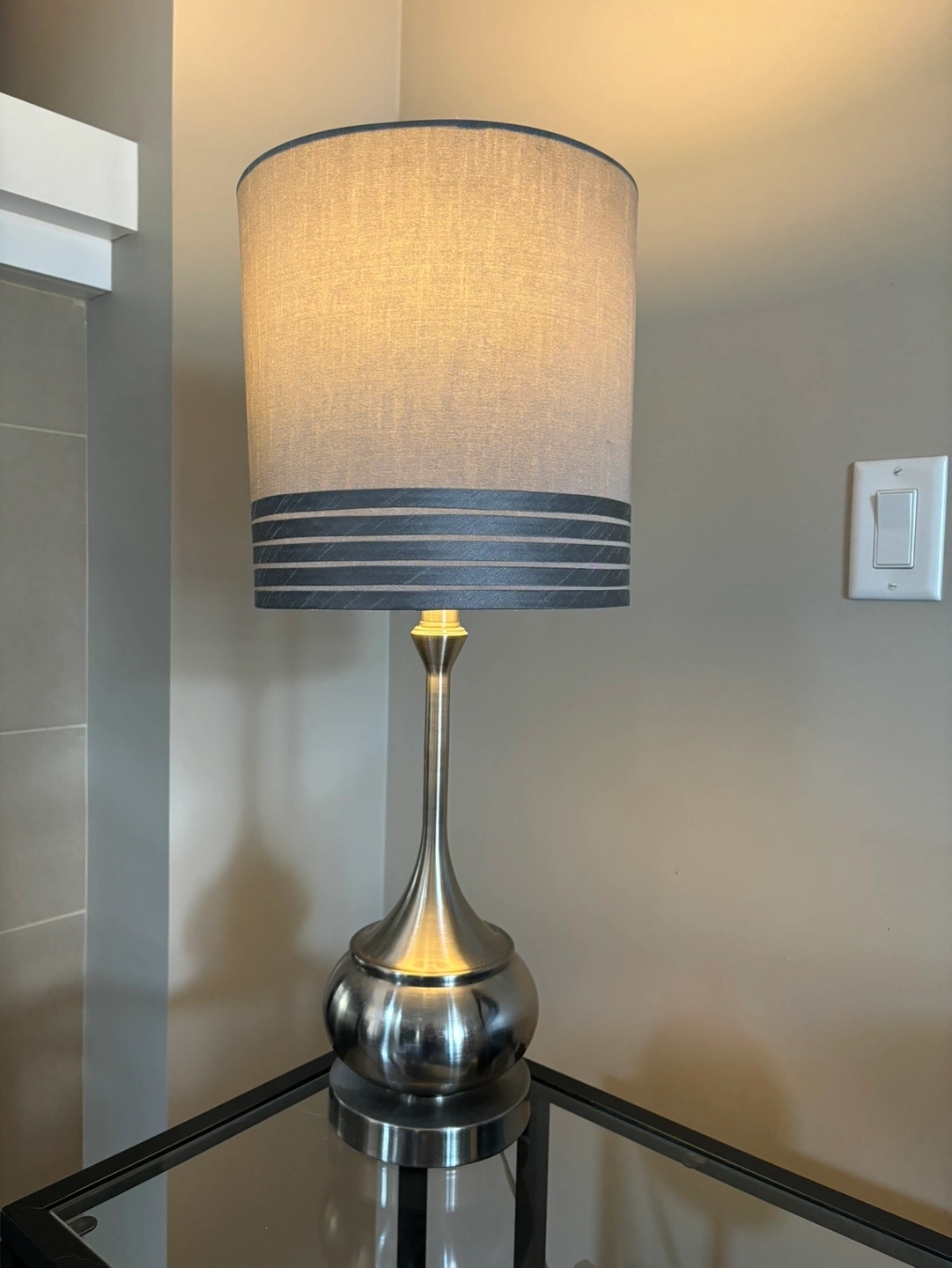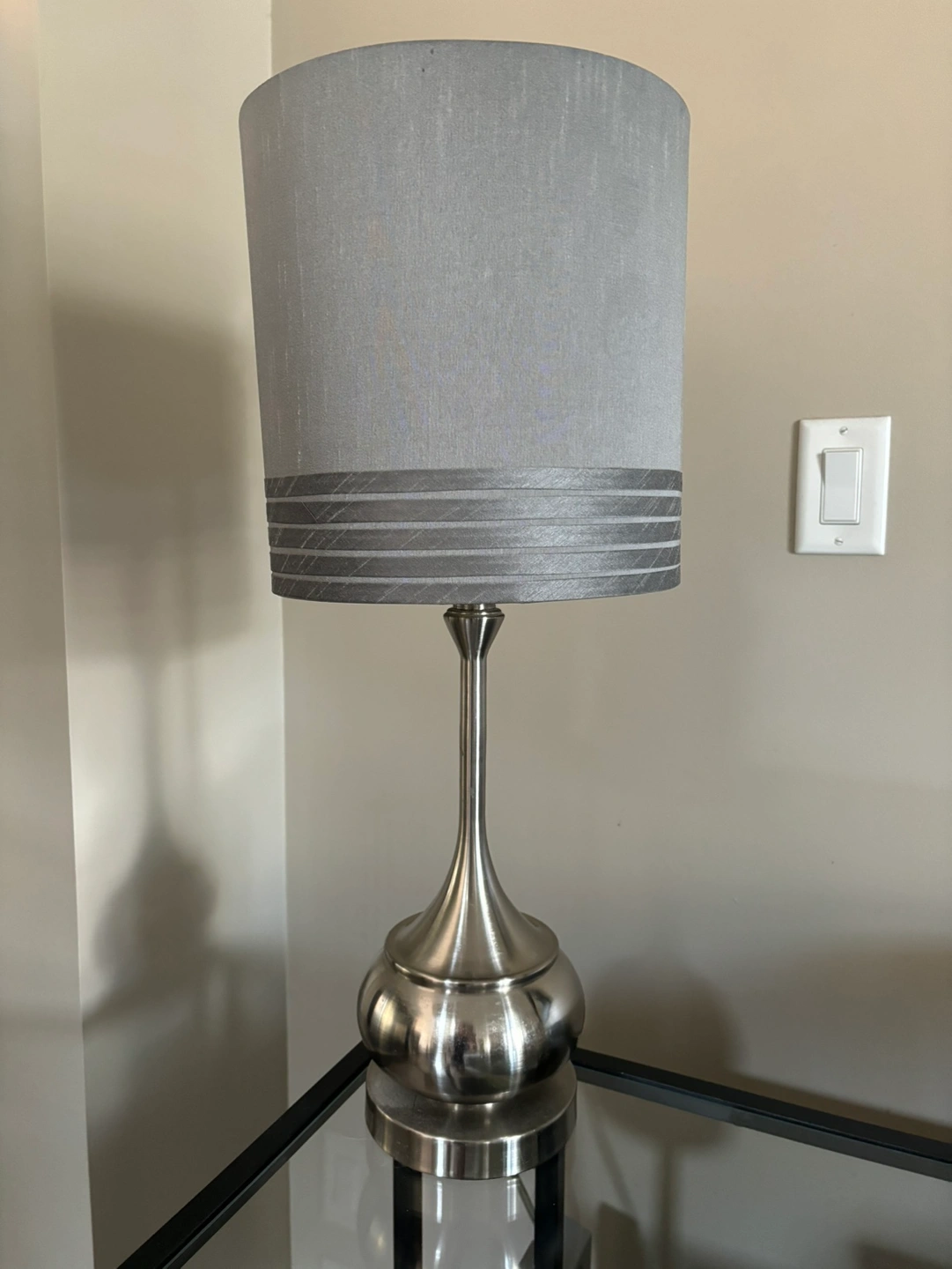 Stands 24” tall, shade is 10” across, made of a really pretty satin finish fabric. Brushed nickel base, with plug in cord and an on/off switch. Takes an E26 bulb. Shade is removable if you wanted to swap it for another. I’m downsizing a lot of my decor so if you’re interested, take a look at my other listings for something you may like! Located in Ellerslie, e-transfer and porch pickup only.