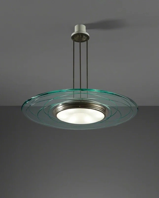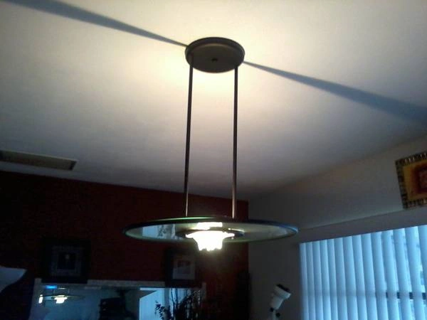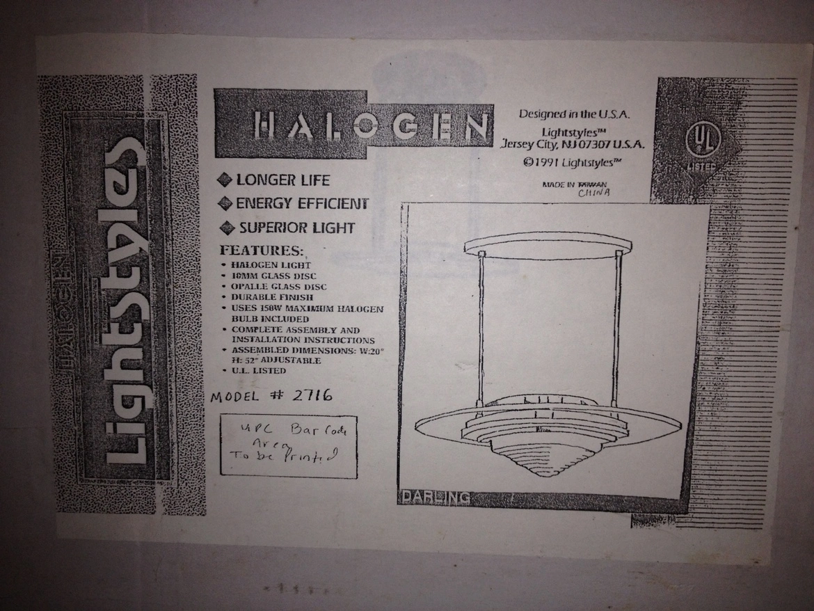 Lightstyles ceiling light model # 2716 uses a 150 watt halogen bulb. It is UL listed. Beautiful for high foyer or dining area with high ceiling. Wide diameter glass disc on metal drop fixture. Drawing on box actual light config. Similar to pics 2-3 New ~ Still in original pkg