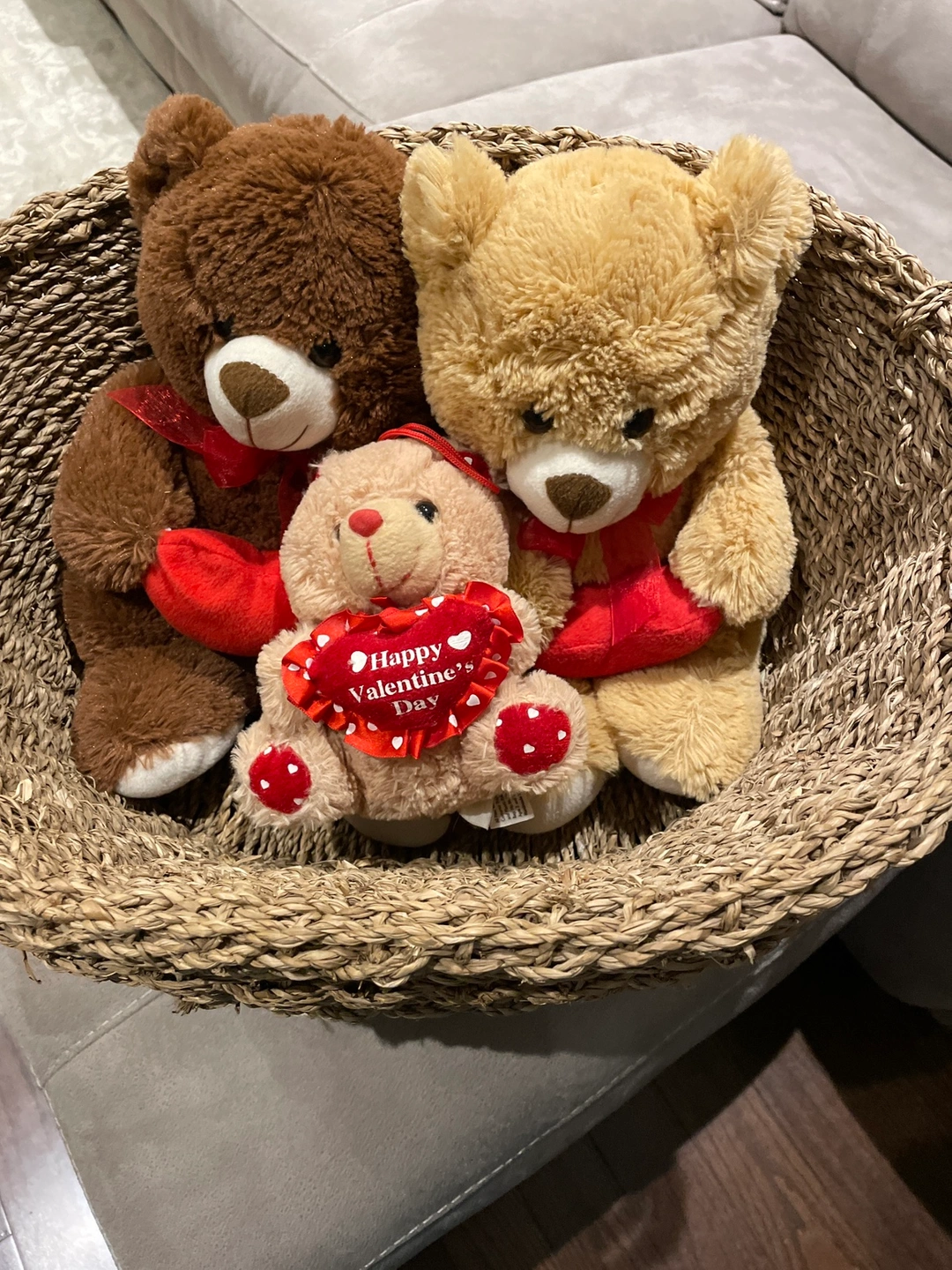 Three plush teddy bears, all wearing red ribbon and a red heart that says "Happy Valentine's Day" on the front.