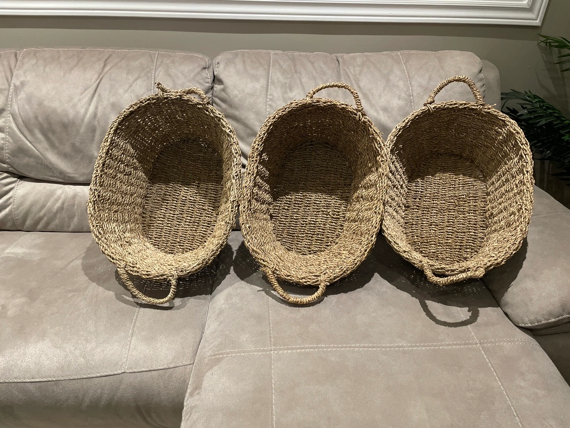 Three oval, woven baskets with handles. They are all the same size. $10 each