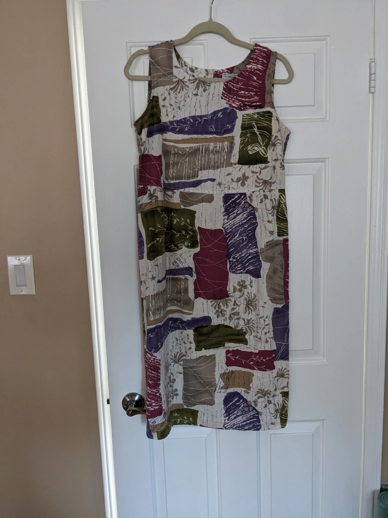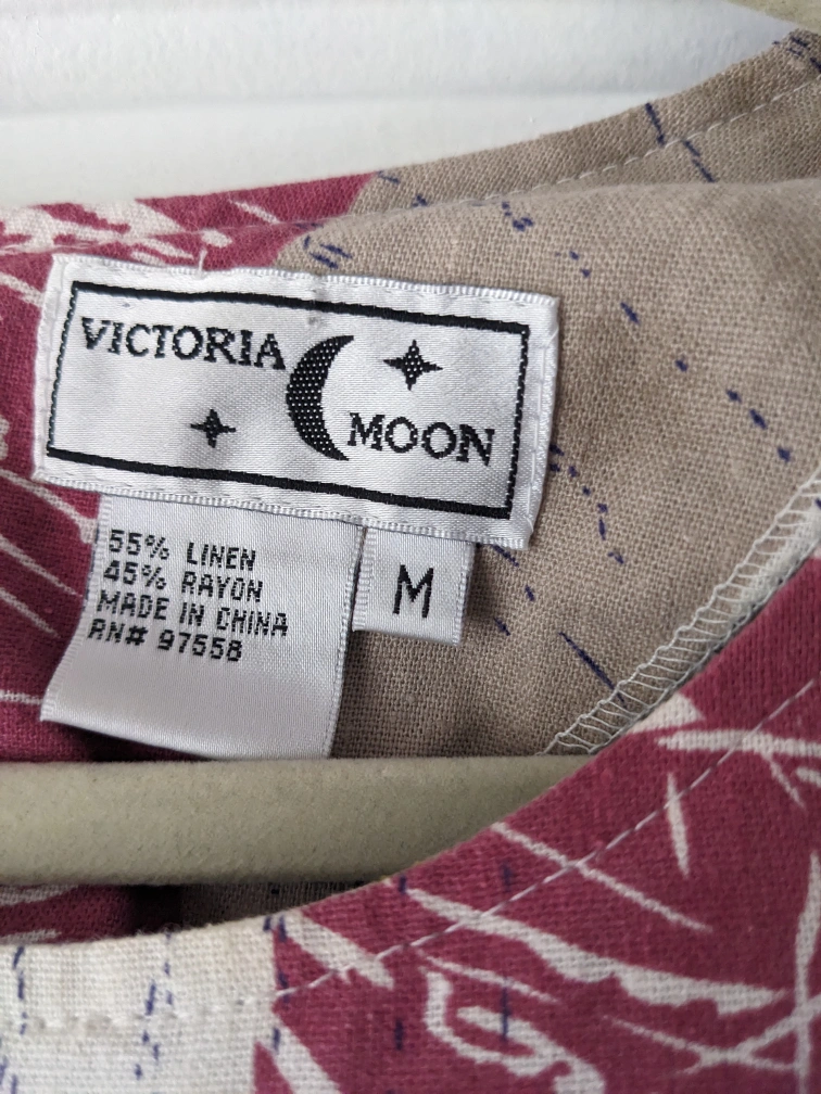 Size M, 55% Linen 45% Rayon. Abstract print with a scoop neck and sleeveless.