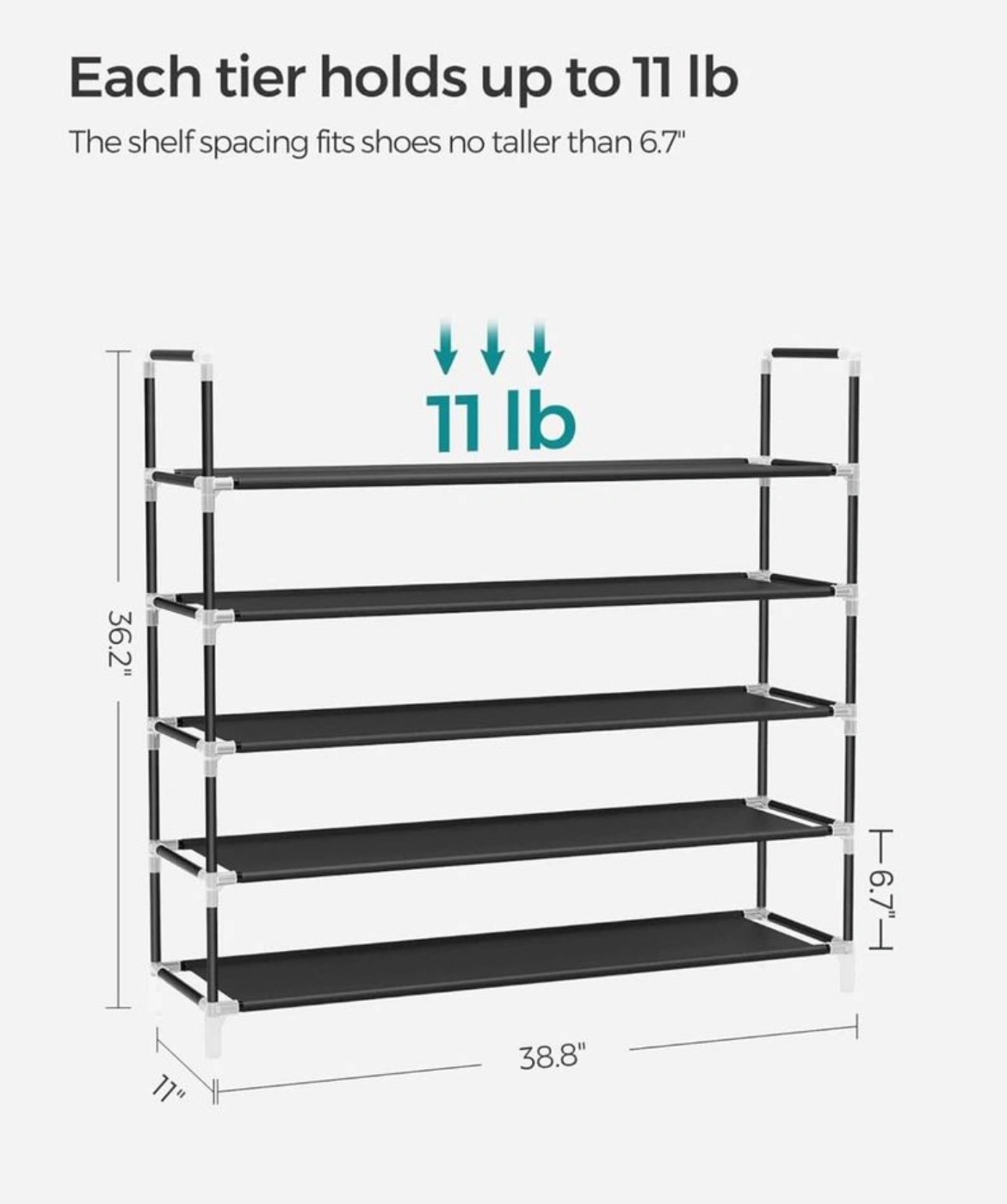 Brand new never used box distressed! This is a 5-tier shoe rack that can hold up to 11 pounds per tier. It's great for organizing your shoes and keeping them off the floor. No returns !