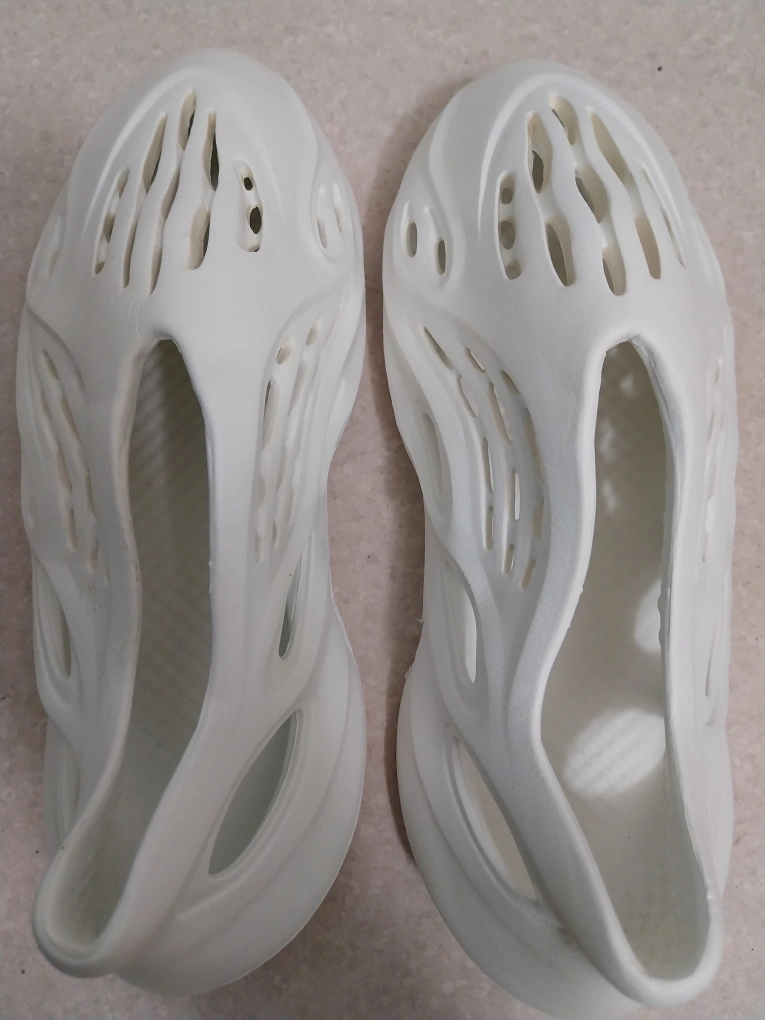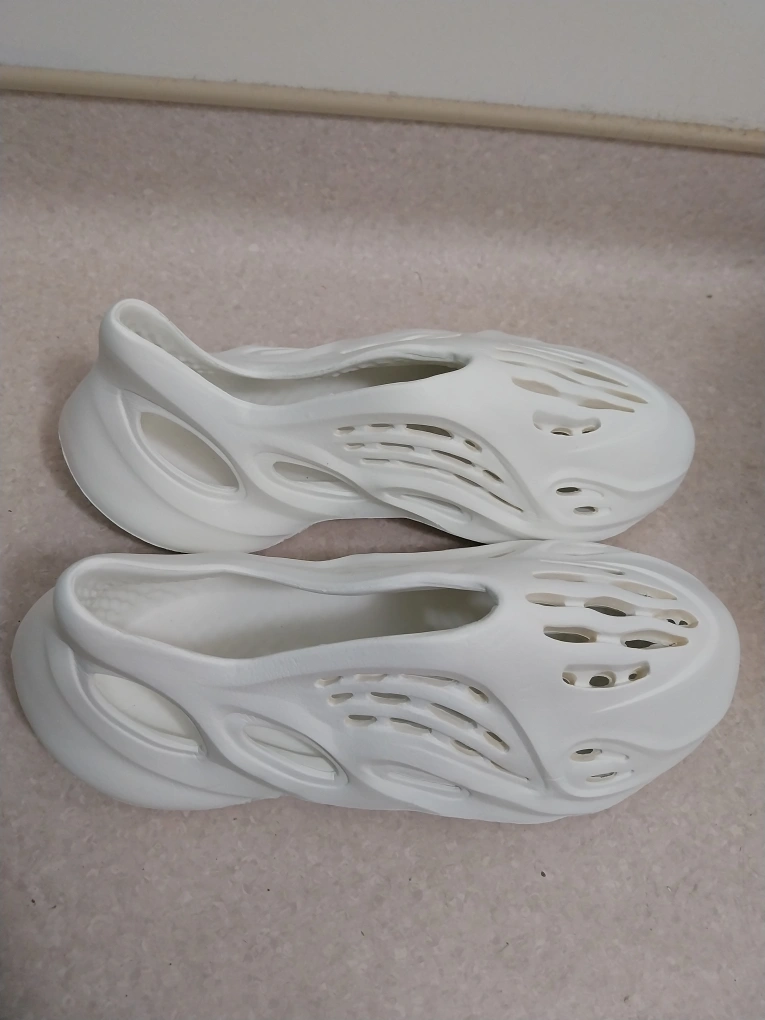These are white foam runner shoes. They have a unique design. They are very lightweight. They are a size 10 US. They are brand new and have never been worn.