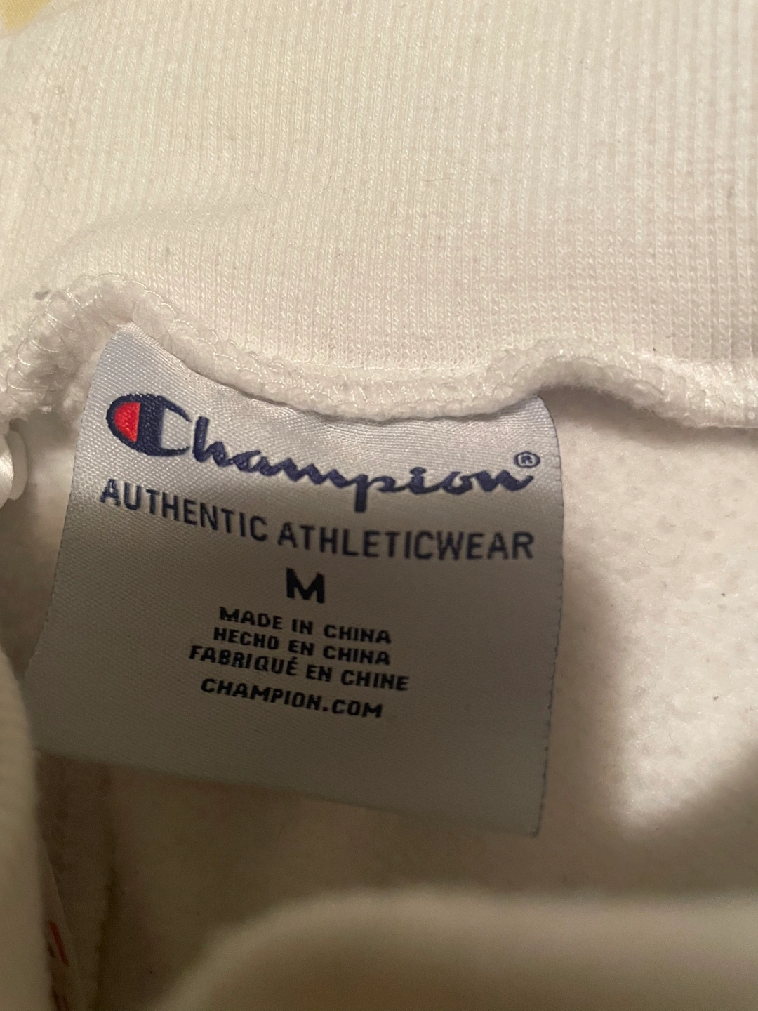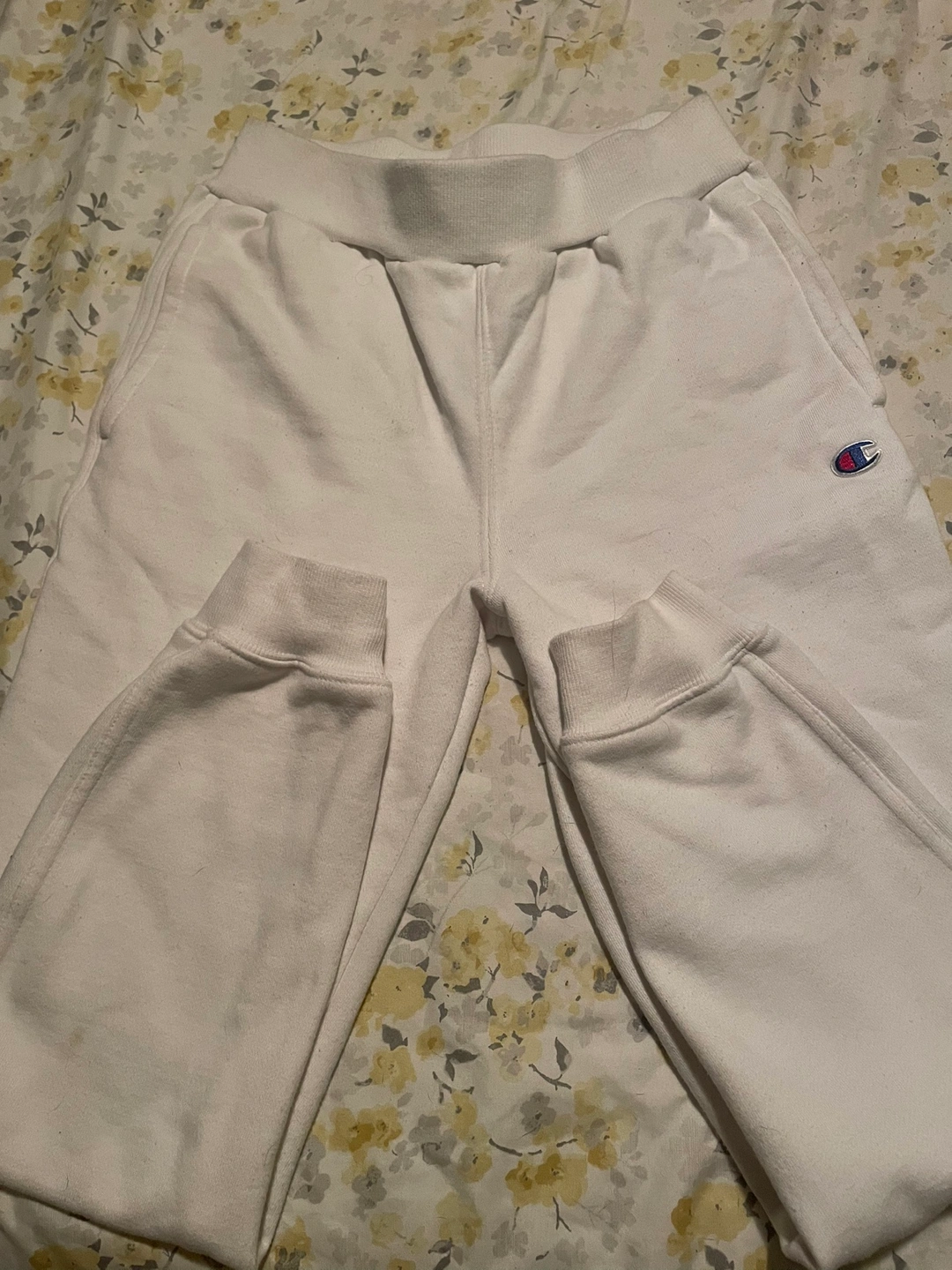Medium size Champion sweatpants in white. These joggers have a relaxed fit and are perfect for everyday wear. They have a small Champion logo on the left leg. Lightly worn, no major damages, stains or discolouration!