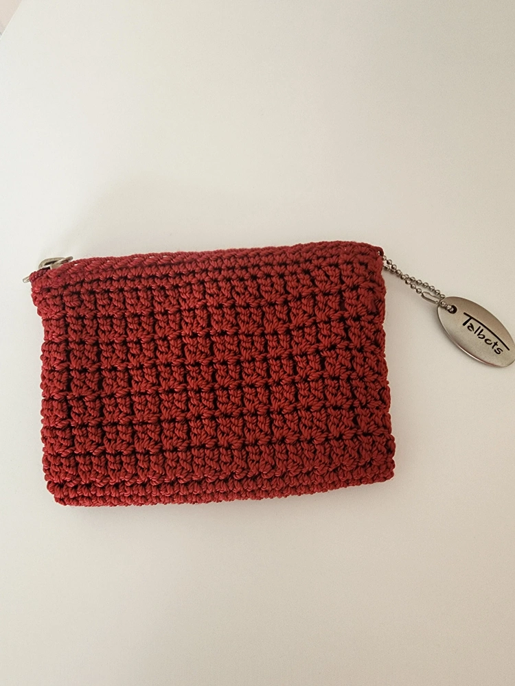 A small red crocheted coin purse (6" x 4") with a zipper closure and a Talbots brand tag. Cash & pick-up only (meet at Pimisi East station)