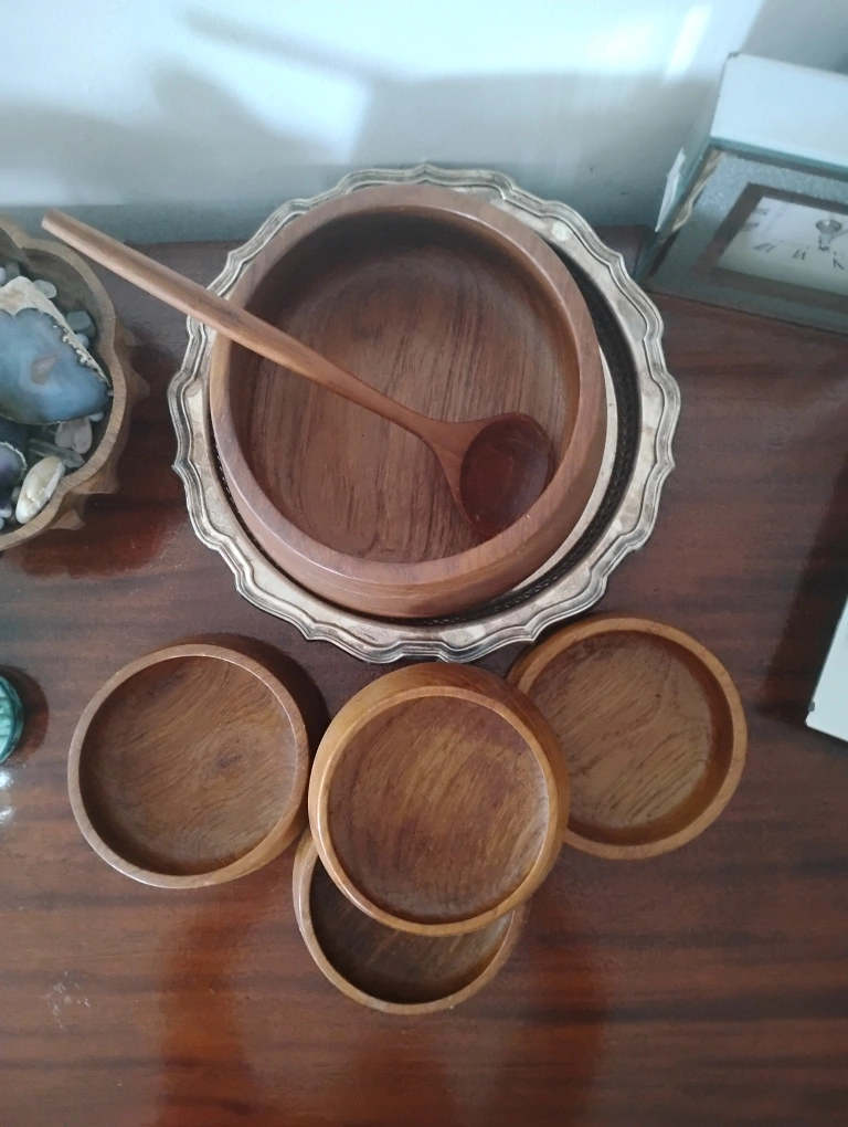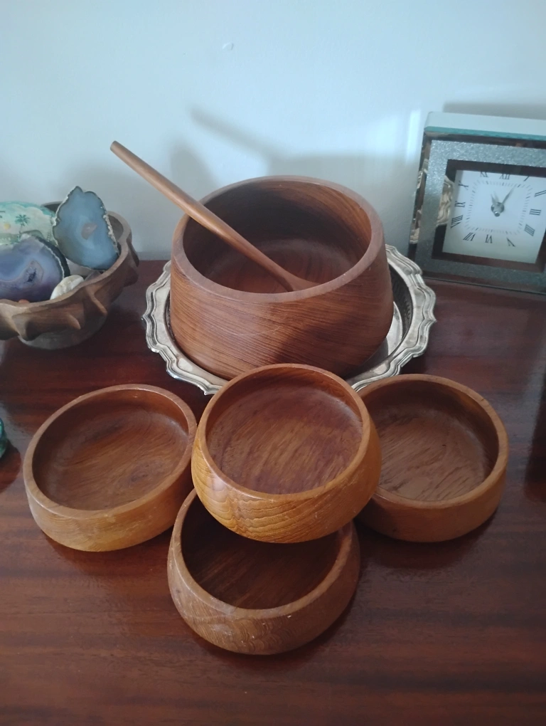 Set includes one large bowl, four smaller bowls, and one serving spoon. Thanks so much for shopping with me ๐ Mid Century Teak Wooden Salad Bowl Set ๐ฅ Calling all Teak Lovers ๐ซ Must Go!