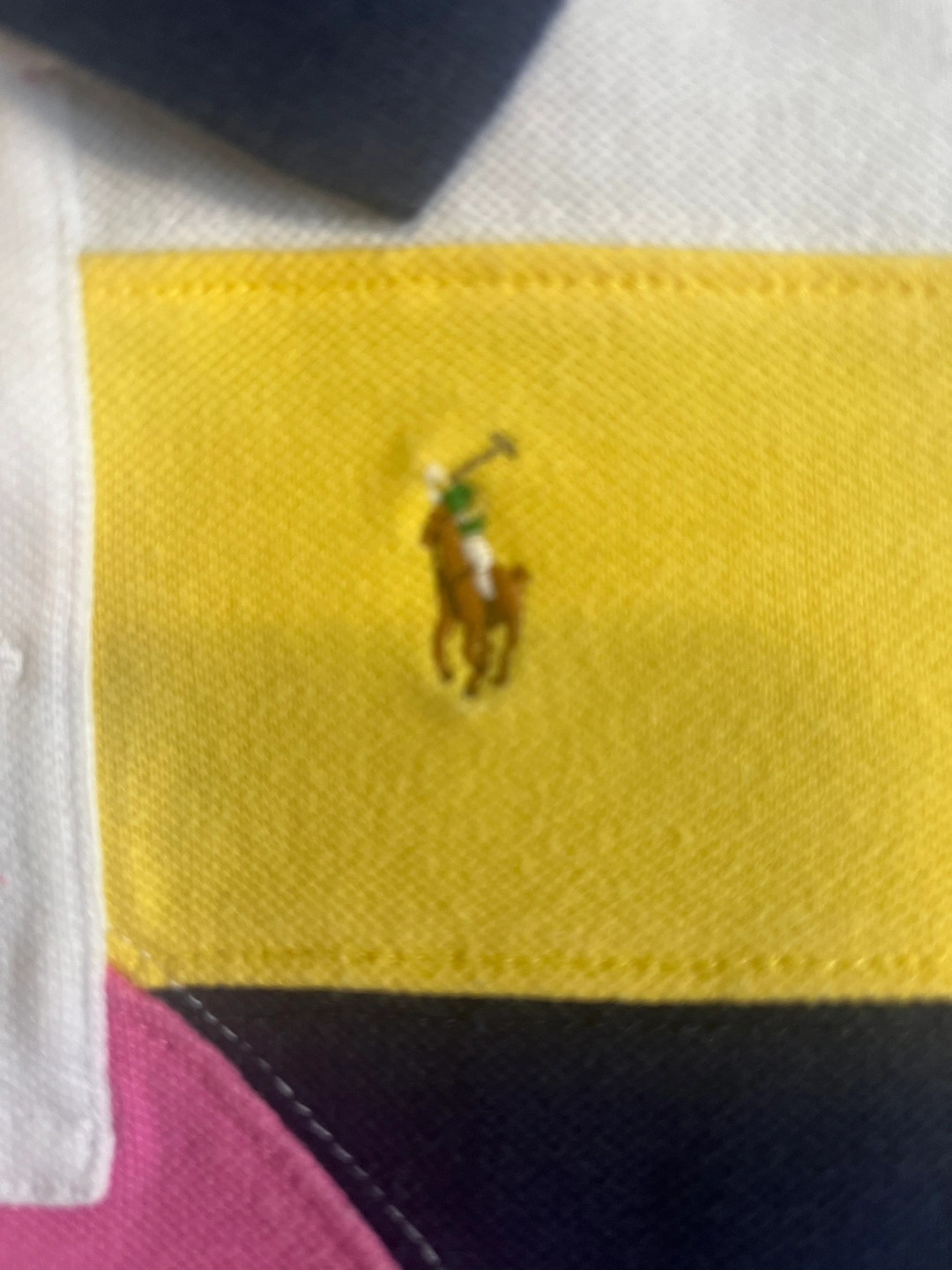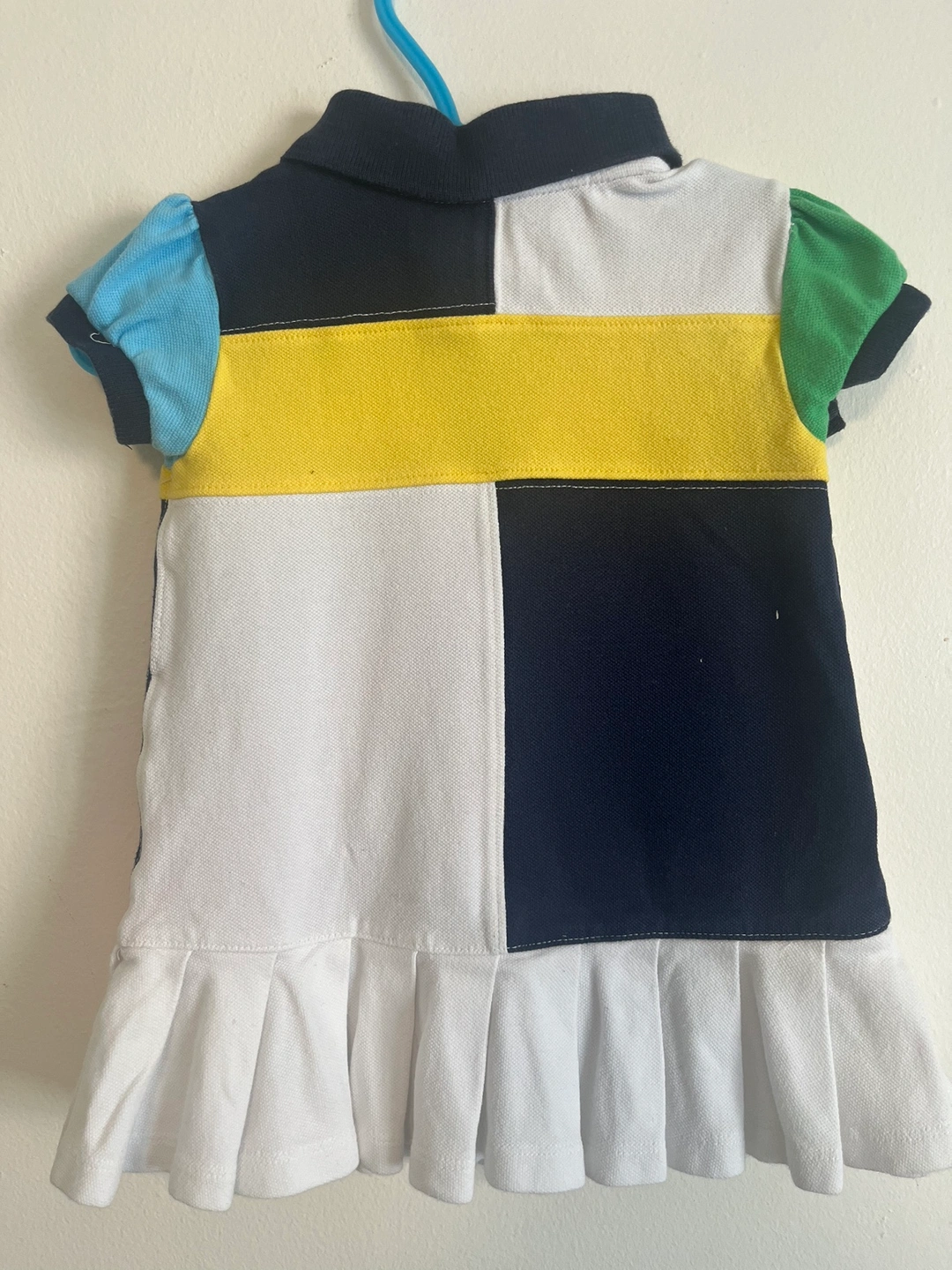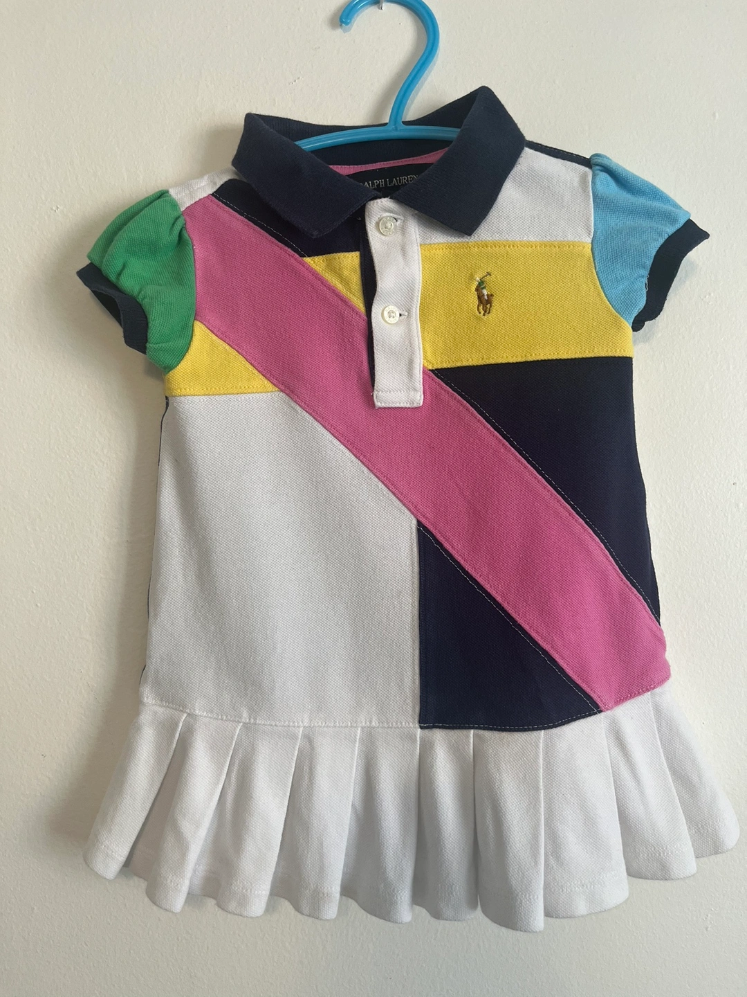 This is a cute and colourful dress with a white, pink, yellow, navy, green and blue colour scheme. It has a collared neckline, short sleeves and a gathered skirt. The dress features a small Polo Ralph Lauren logo on the chest. This dress would be perfect for a little girl who loves to look stylish!