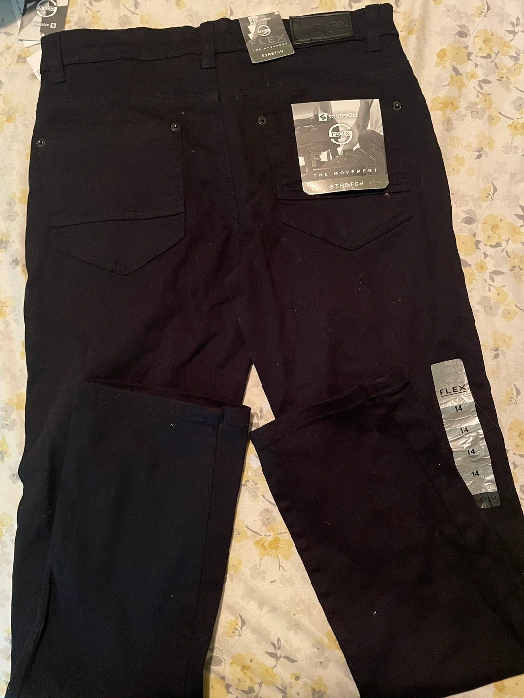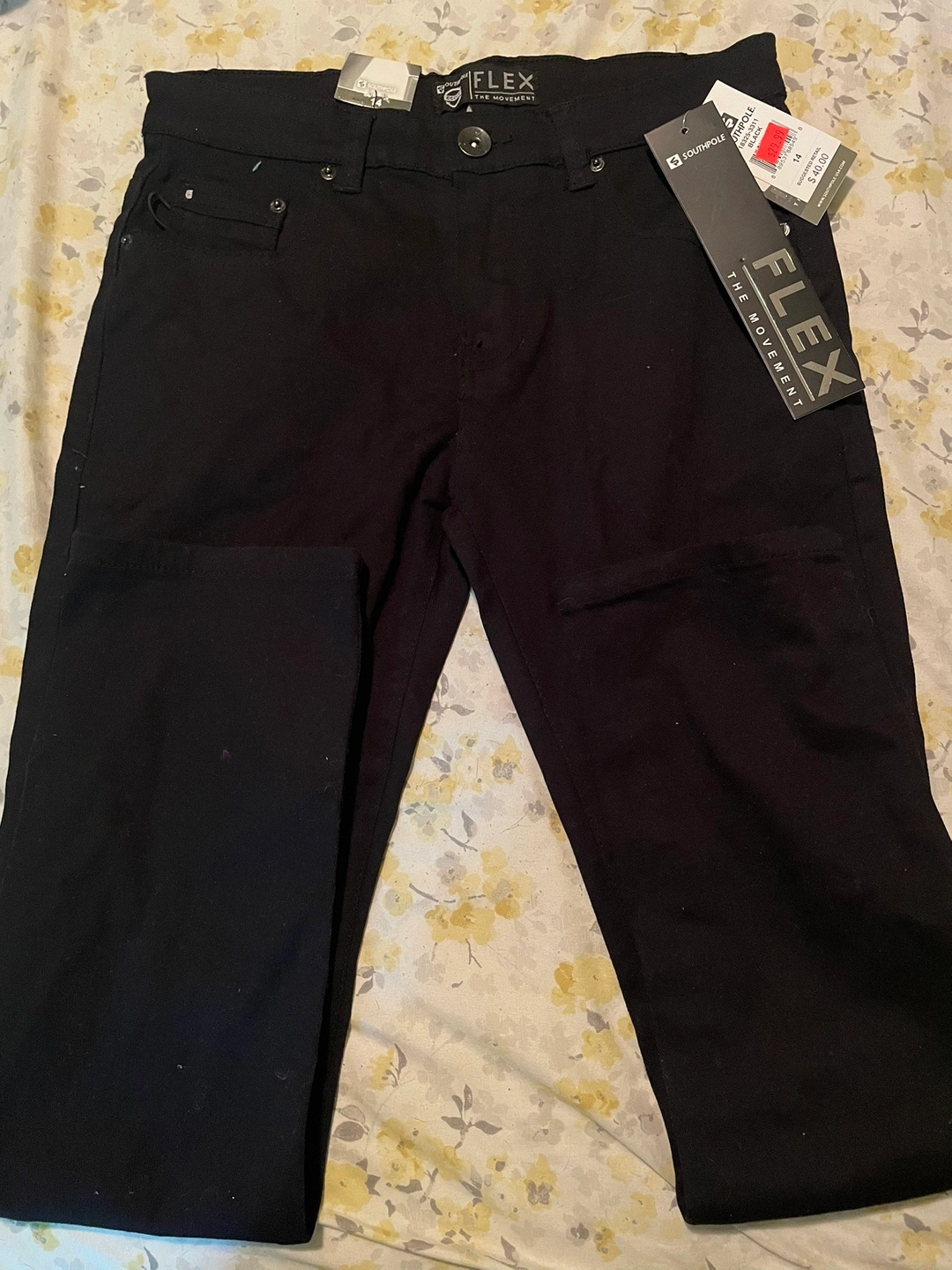 Black jeans with a size 14 waist. They are a straight leg fit. The jeans are stretchy. Brand new with tags, never worn!