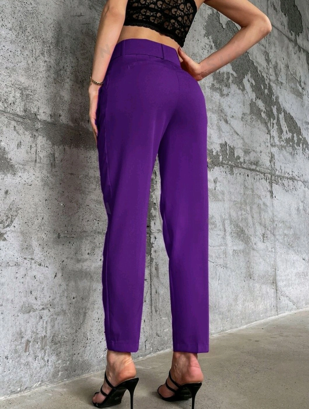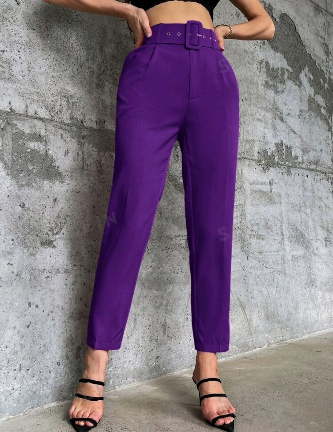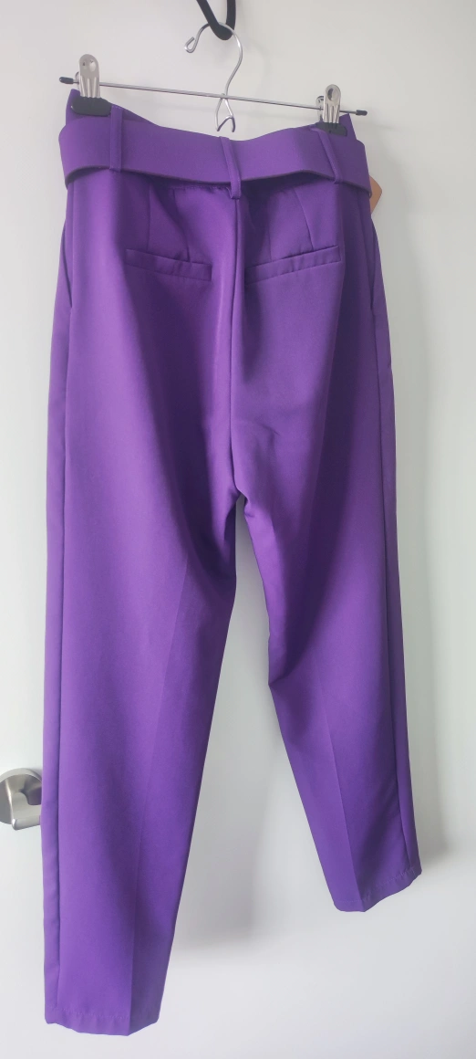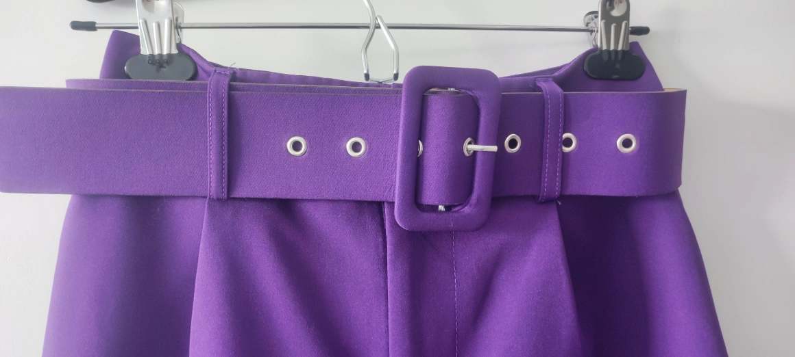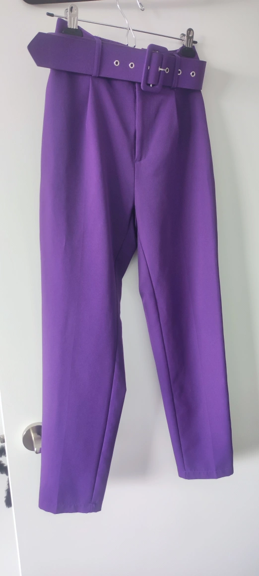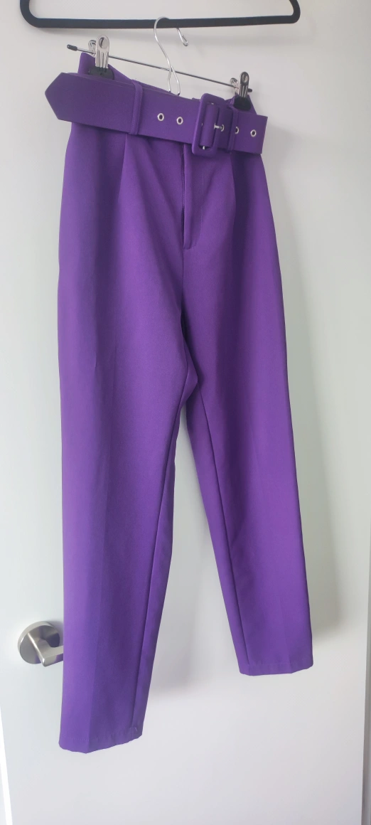 High-waisted pants with a belt. The pants are a bright purple colour. They have a straight leg.