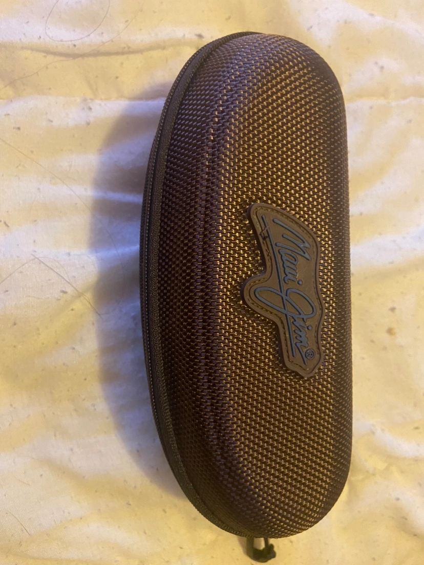 Brown hard-shell case with zipper closure and clip.