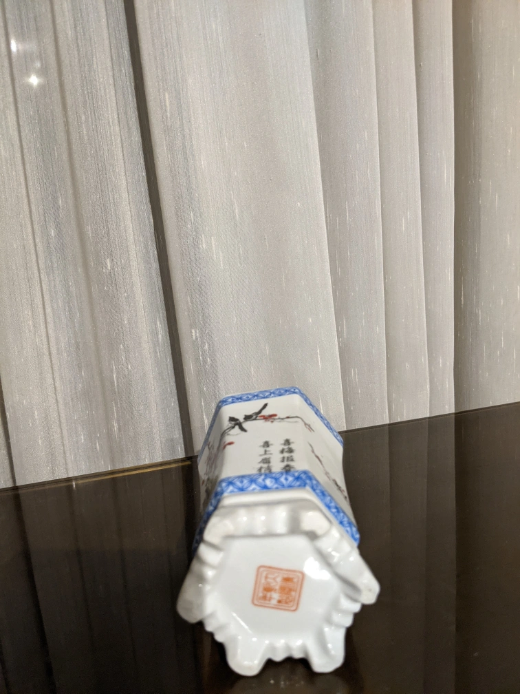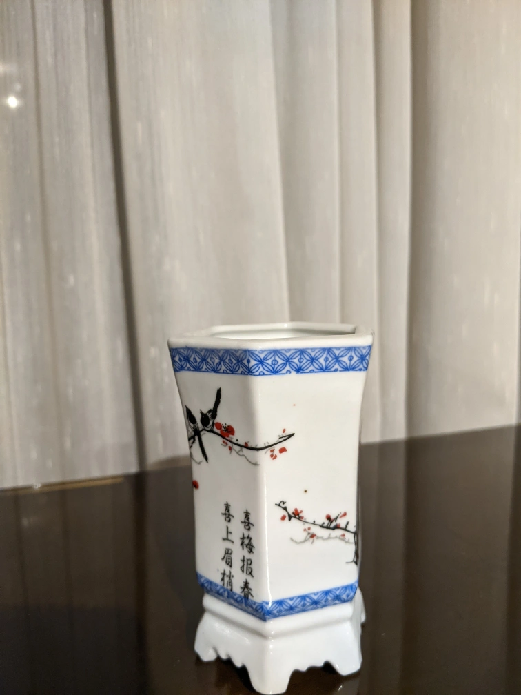 This is a small porcelain vase with blue and white trim and a flower design. It has a base with four legs. It is approximately 5 inches tall. It is an octagonal shape.