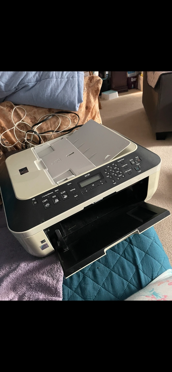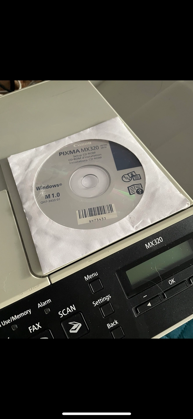 This is a Canon PIXMA MX320 All-in-One printer. It comes with the original CD-ROM and instruction manual. It includes print, scan, copy, and fax functionalities. Great for a student. Works perfectly, I just got an Eco-tank due to volume of printing.