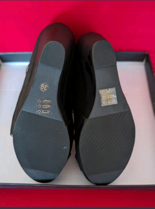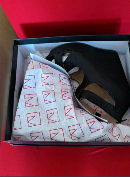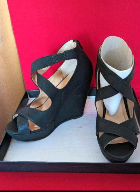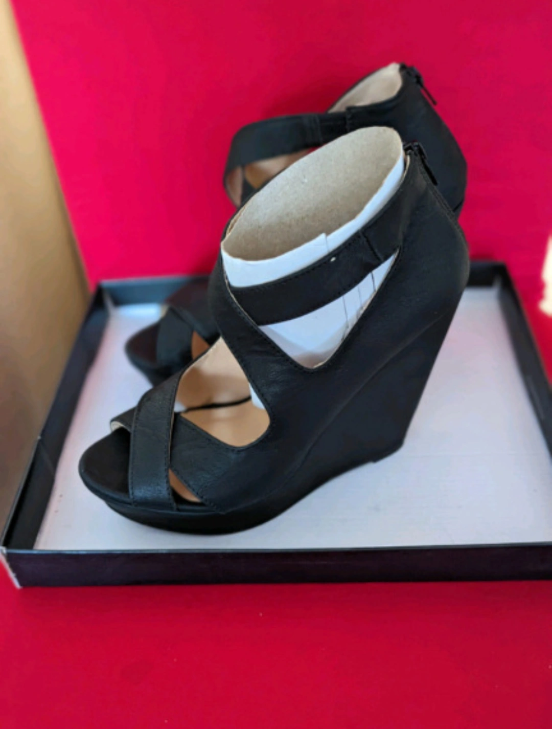 These black leather sandals are a stylish and comfortable option for any occasion. They feature a wedge heel and an ankle strap for a secure fit. New in box