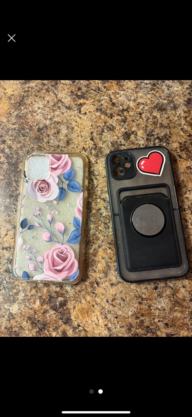 Two phone cases - one with a floral pattern and good condition, one with a heart and a magnetic plate for a phone holder. Five dollars each.