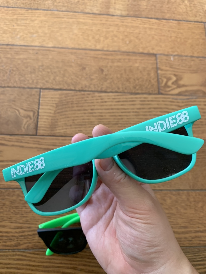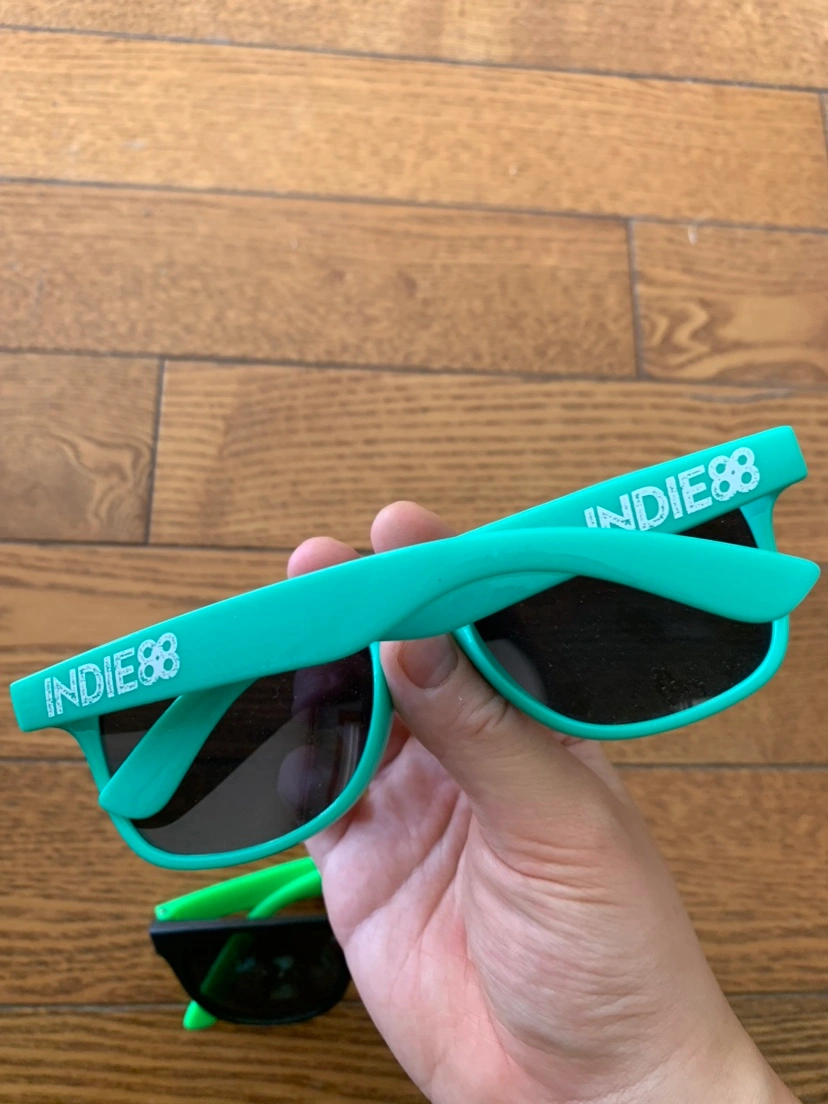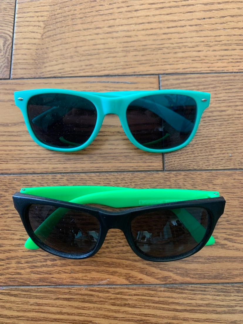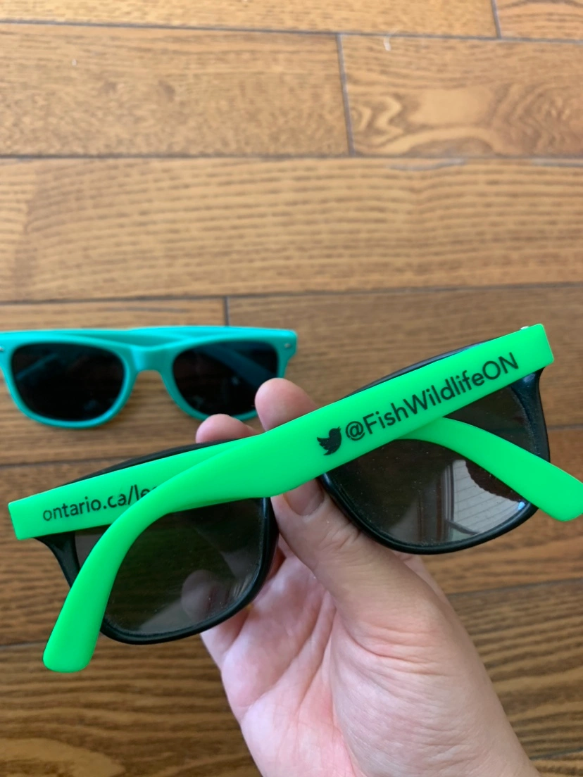 Pair of sunglasses: green with "Indie88" logo and black with "FishWildlifeON" logo. Sizing notes: both sunglasses are 5.5 inches in width. Able to meet up at any TTC subway station on the yellow line Comes from pet free, smoke free, and bug free home Check out my other listings