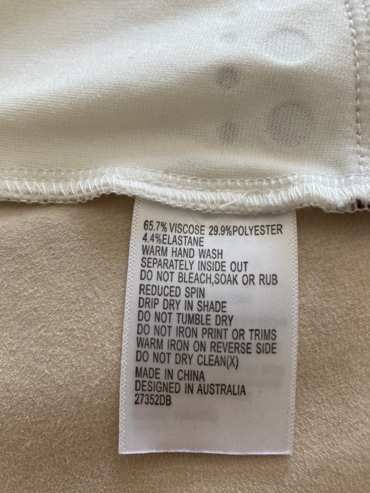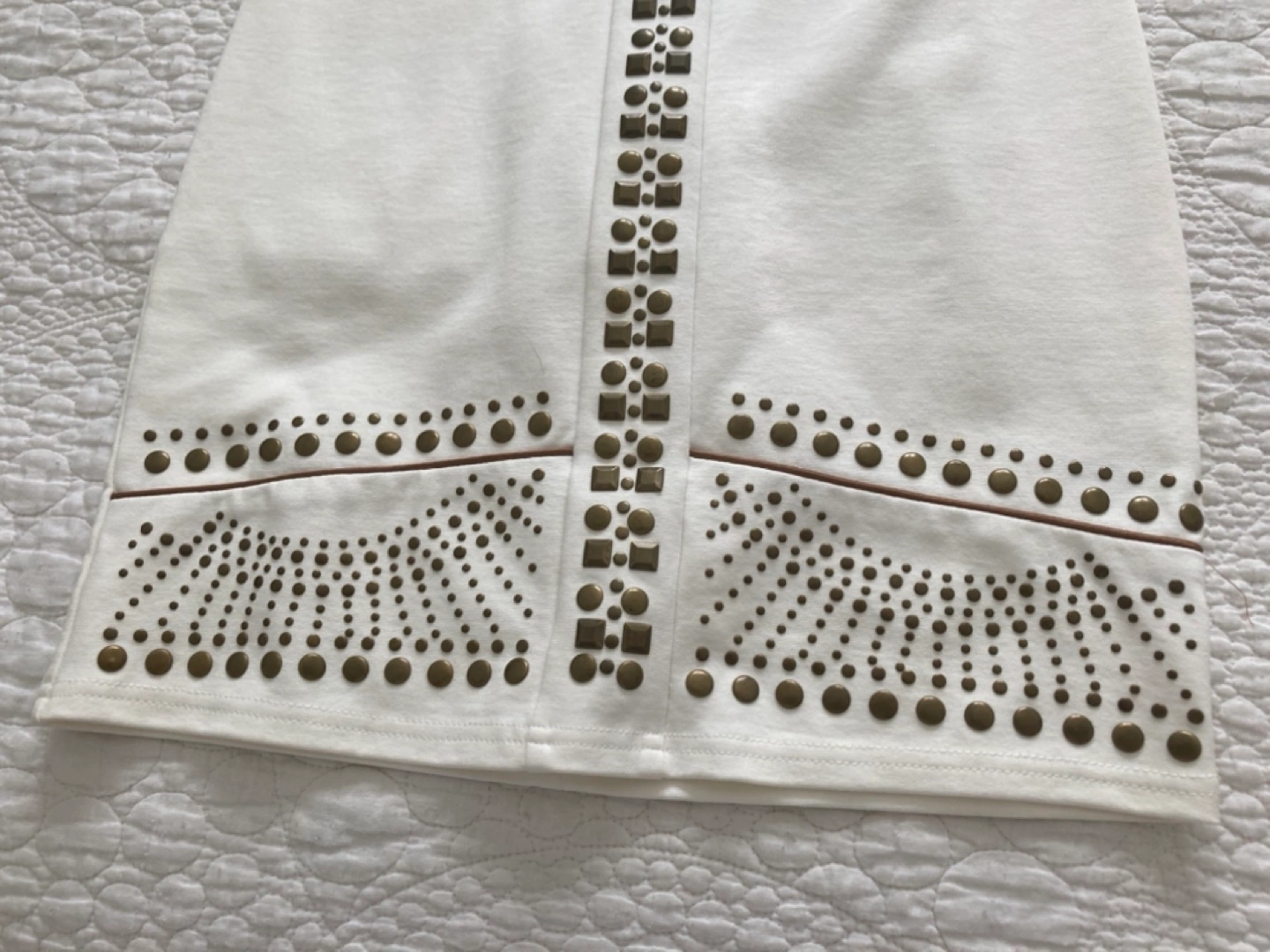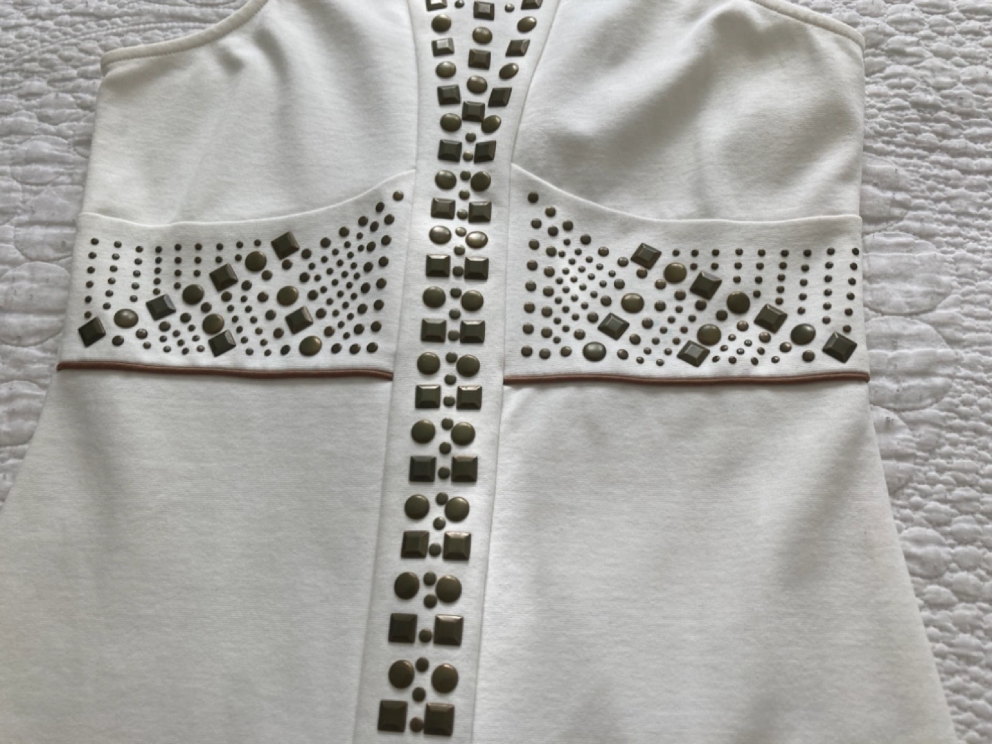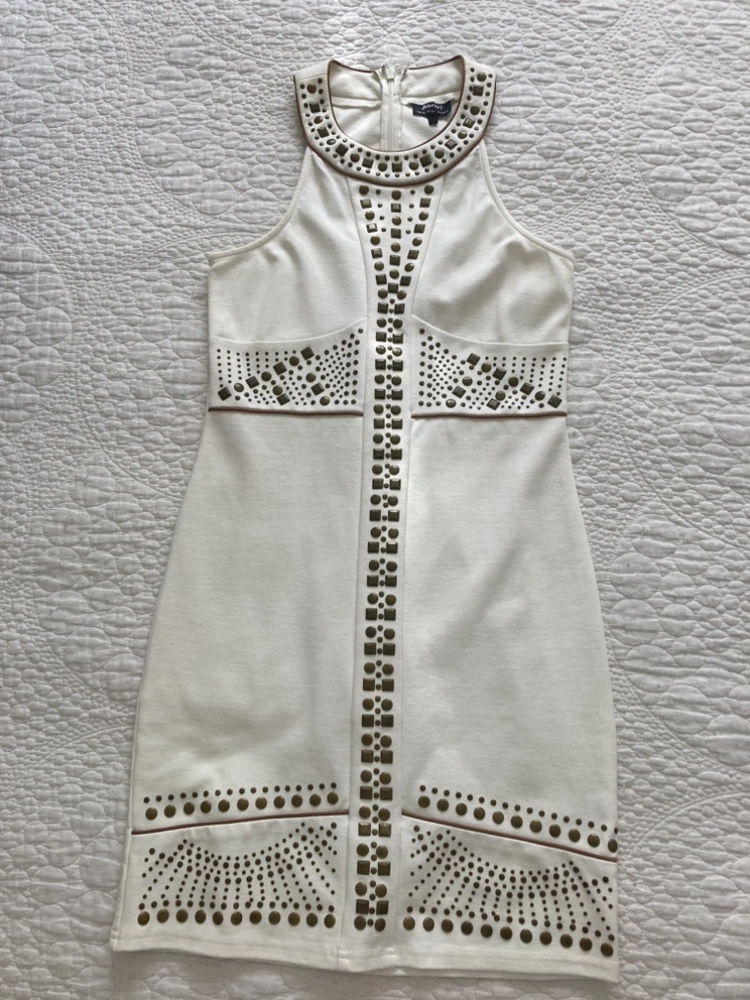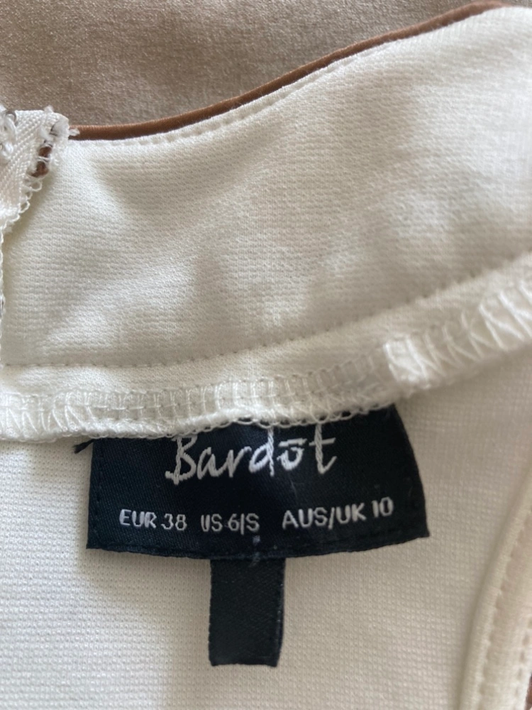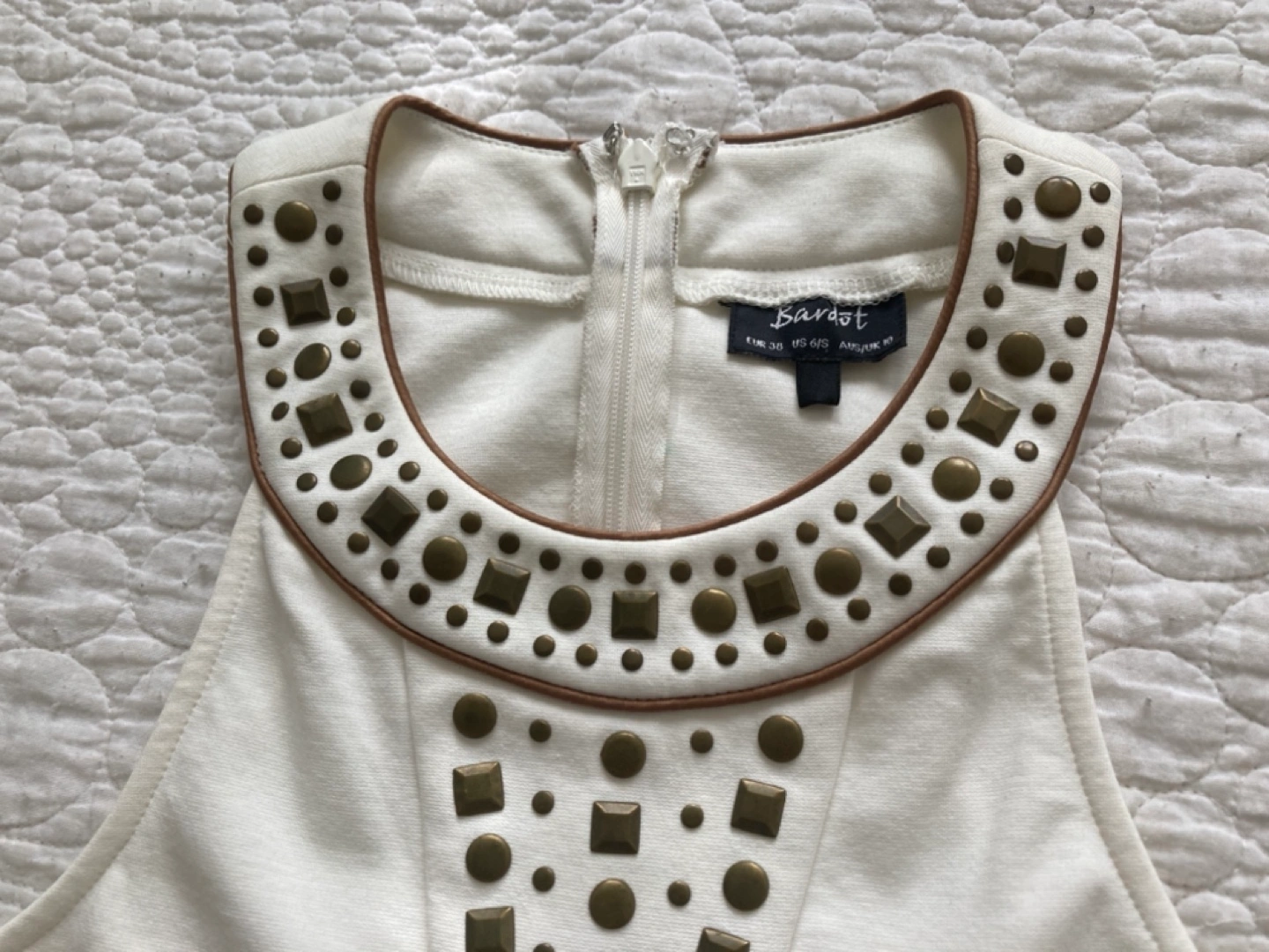 Studded detailed Bardot dress with stretch. Off-white colour. Size S. Fits bust 34 well. Never worn. 66% viscose, 30% polyester, 4% elastane. Designed in Australia.