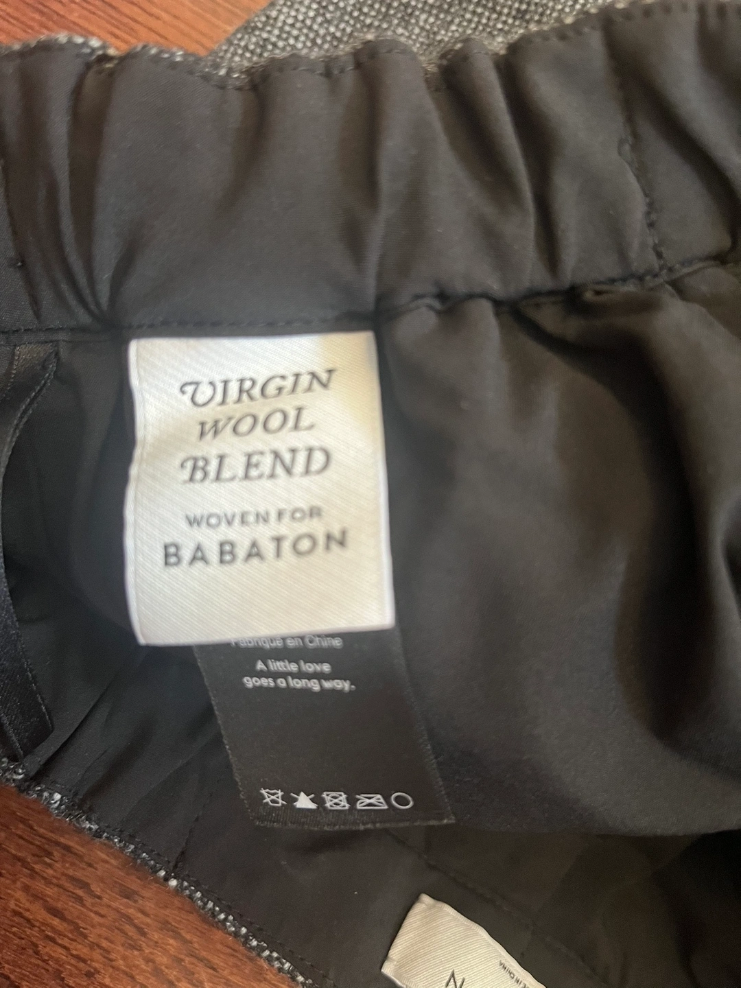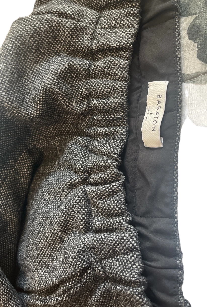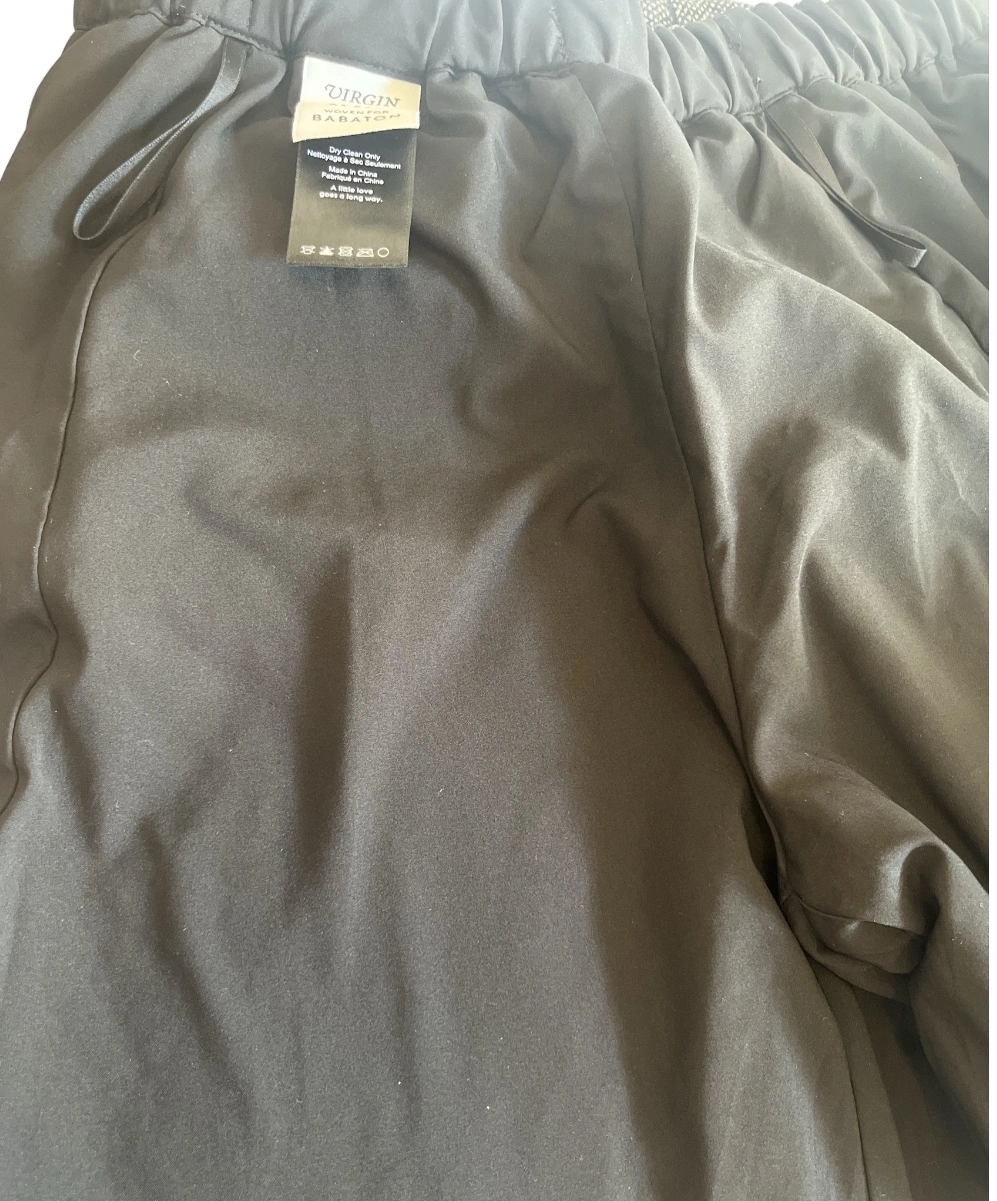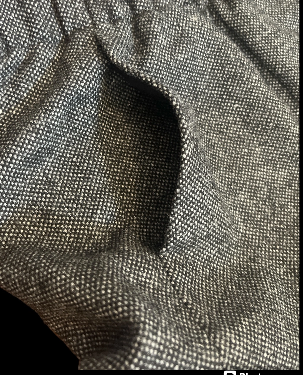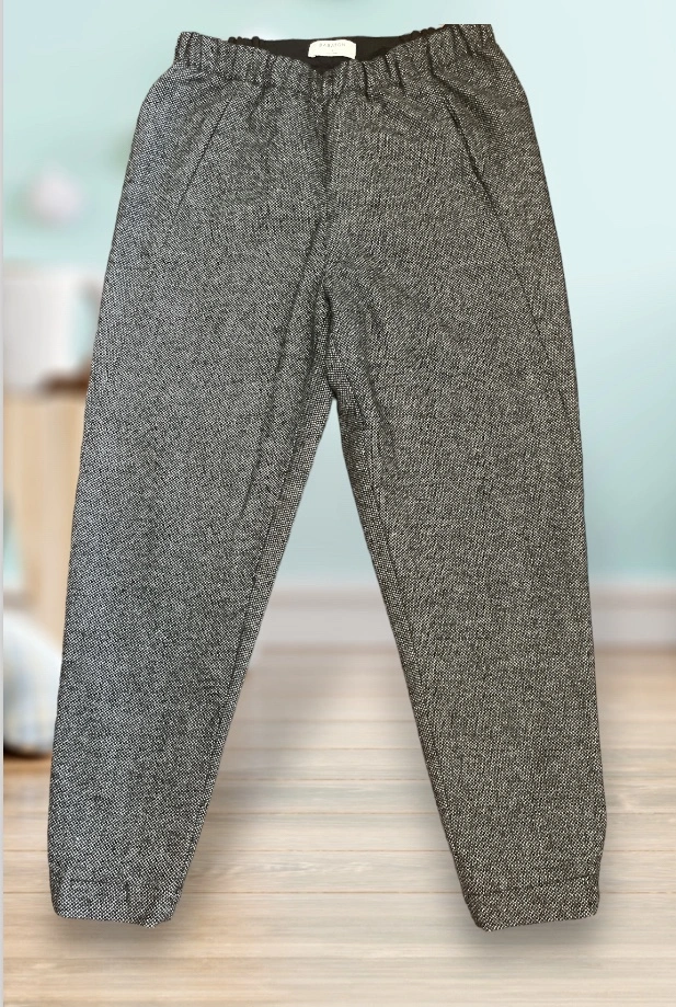 Black and grey wool blend trousers. Elastic waistband with pockets.